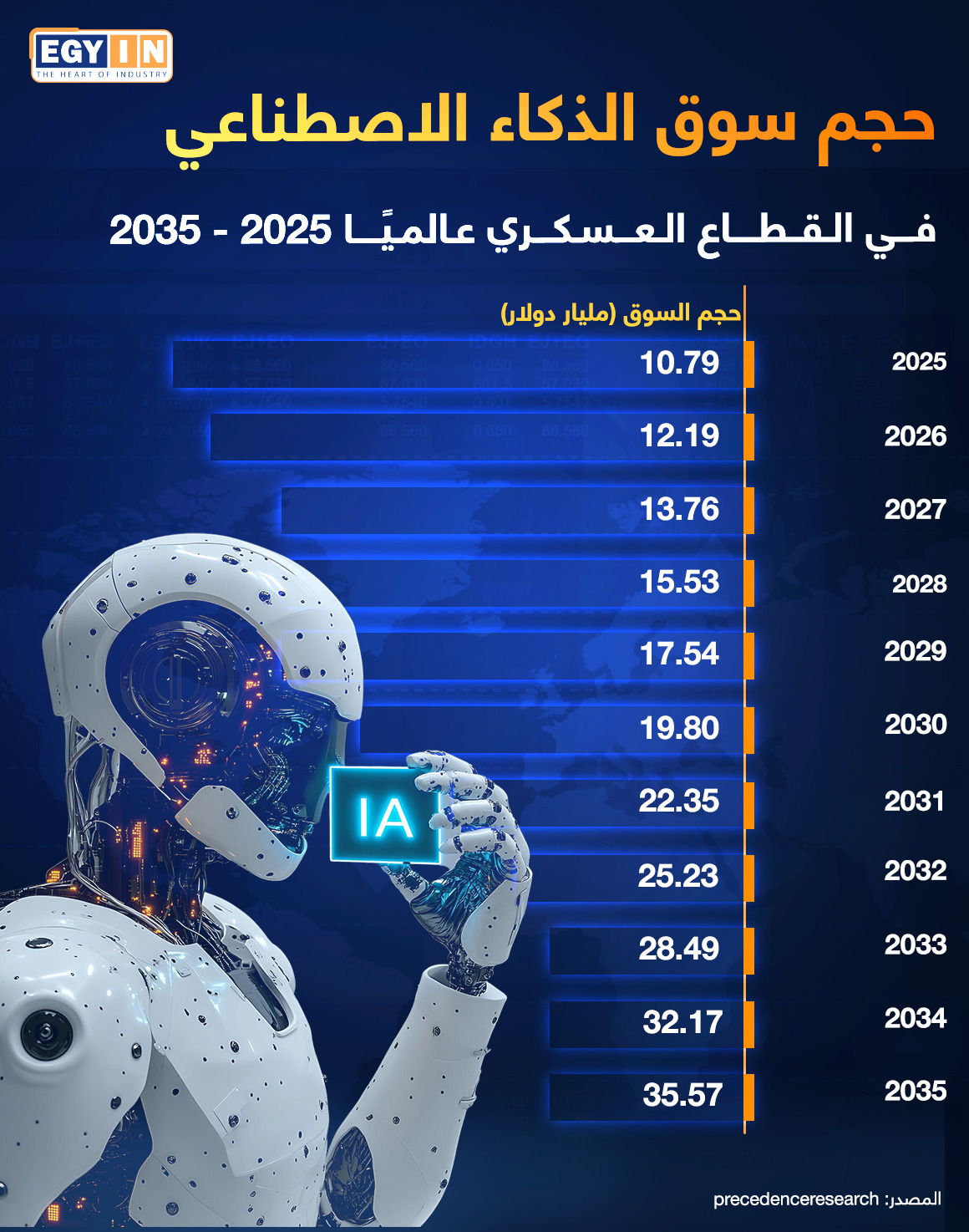 ويستمر هذا النمو المتسارع في السنوات التالية، حيث يصل السوق إلى 25.23 مليار دولار في عام 2032، ثم 28.49 مليار دولار في عام 2033، وهو ما يعكس توسعًا متزايدًا في تطبيقات الذكاء الاصطناعي العسكرية مثل الطائرات المسيرة والأنظمة الدفاعية الذاتية، أما في عام 2034 فيبلغ حجم السوق نحو 32.17 مليار دولار قبل أن يصل إلى 35.57 مليار دولار بحلول عام 2035.