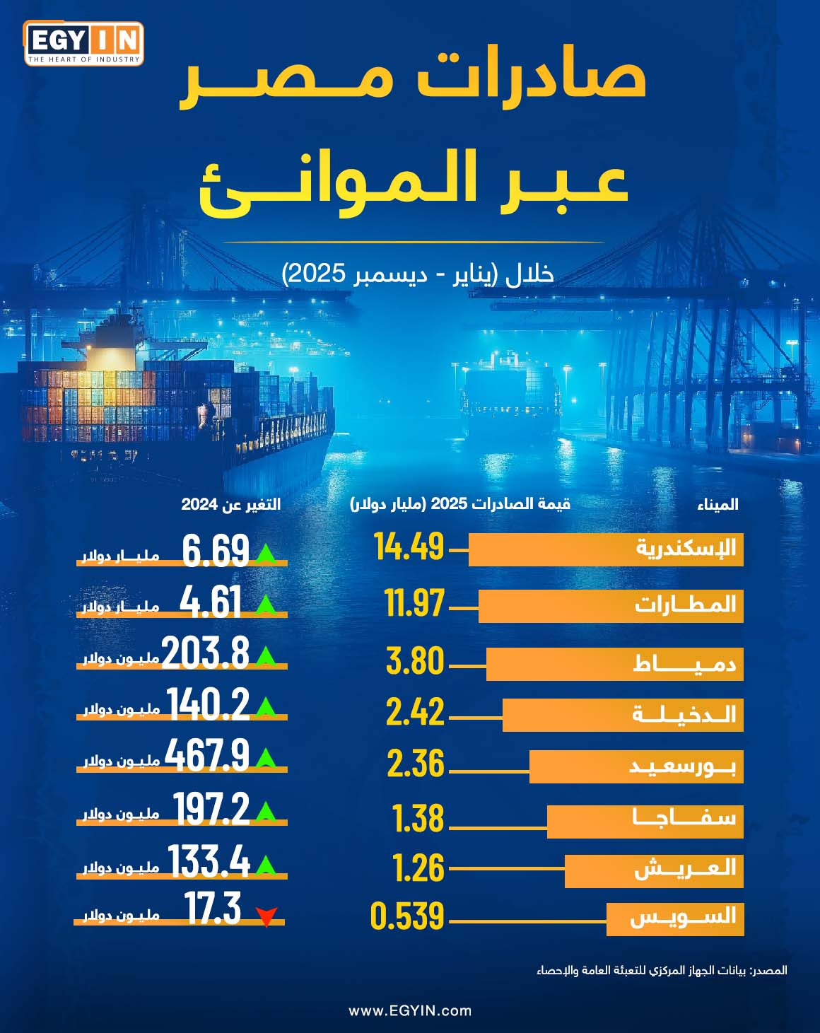 ويستعرض موقع "إيجي إن" من خلال الإنفوجراف التالي، قائمة صادرات مصر عبر الموانئ خلال الفترة من يناير إلى ديسمبر 2025، وفقًا لأحدث بيانات واردة عن الجهاز المركزي للتعبئة العامة والإحصاء.