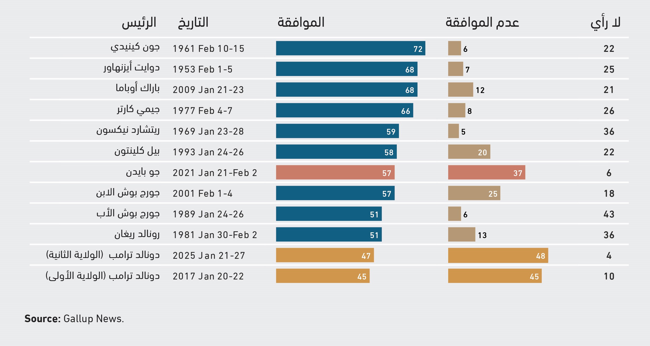 نسبة الموافقة على أداء ترامب في بداية ولايته الأولى والثانية مقارنة بالرؤساء السابقين