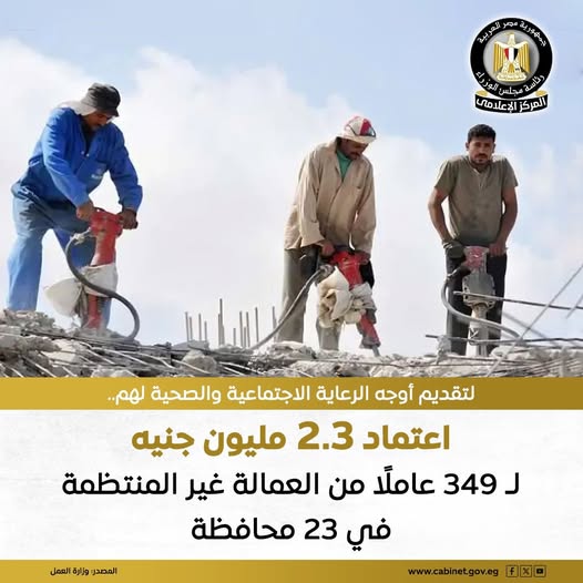 اعتمدت وزارة العمل صرف مبلغ 2 مليون و265 ألفًا و570 جنيهًا لتقديم أوجه الرعاية الاجتماعية والصحية لعدد 349 عاملًا من العمالة غير المنتظمة في 23 محافظة، وذلك من الحساب المركزي لحماية ورعاية العمالة غير المنتظمة بوزارة العمل.