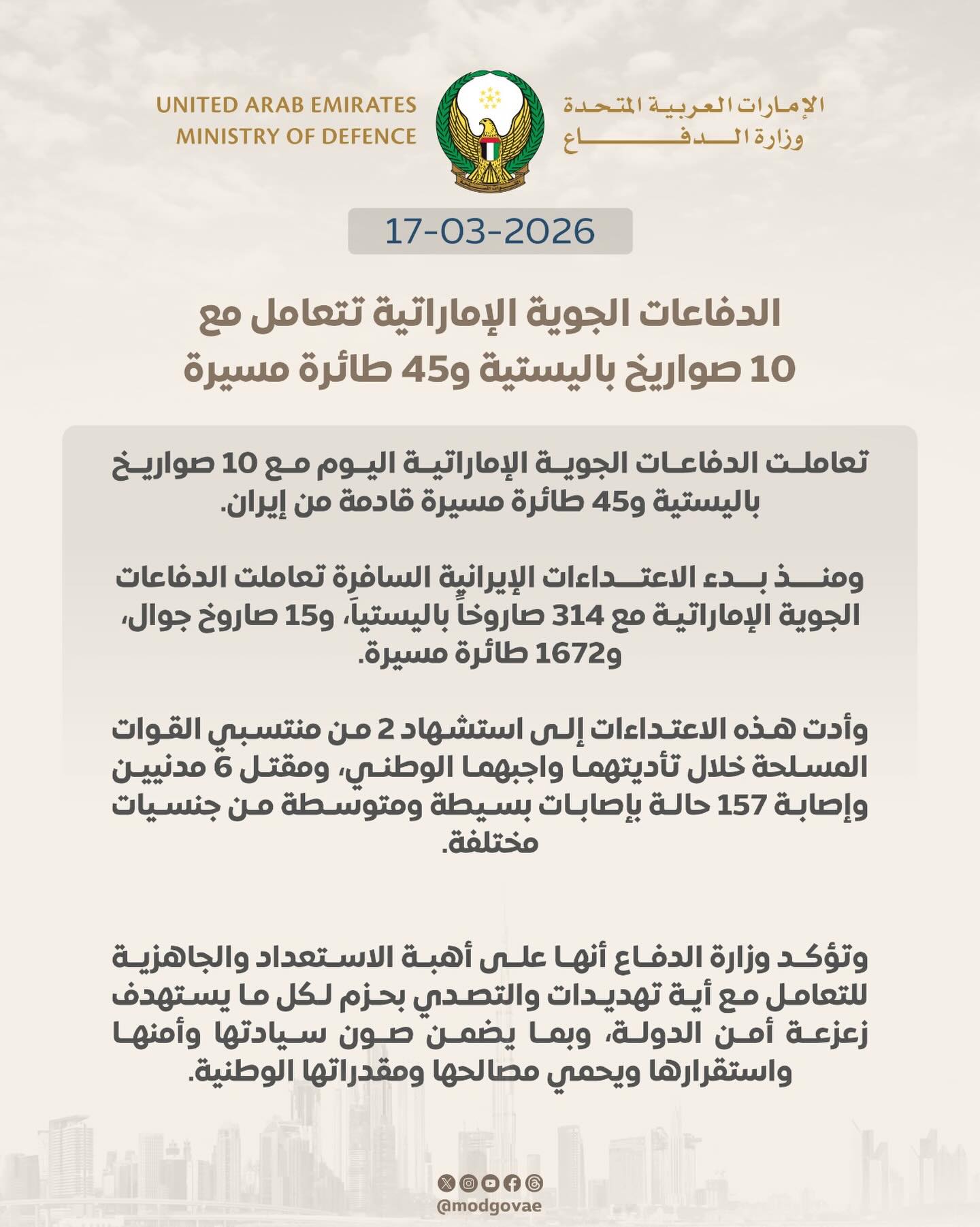 أعلنت وزارة الدفاع الإماراتية، تعاملها مع 10 صواريخ باليستية، و45 طائرة مسيرة قادمة من إيران.