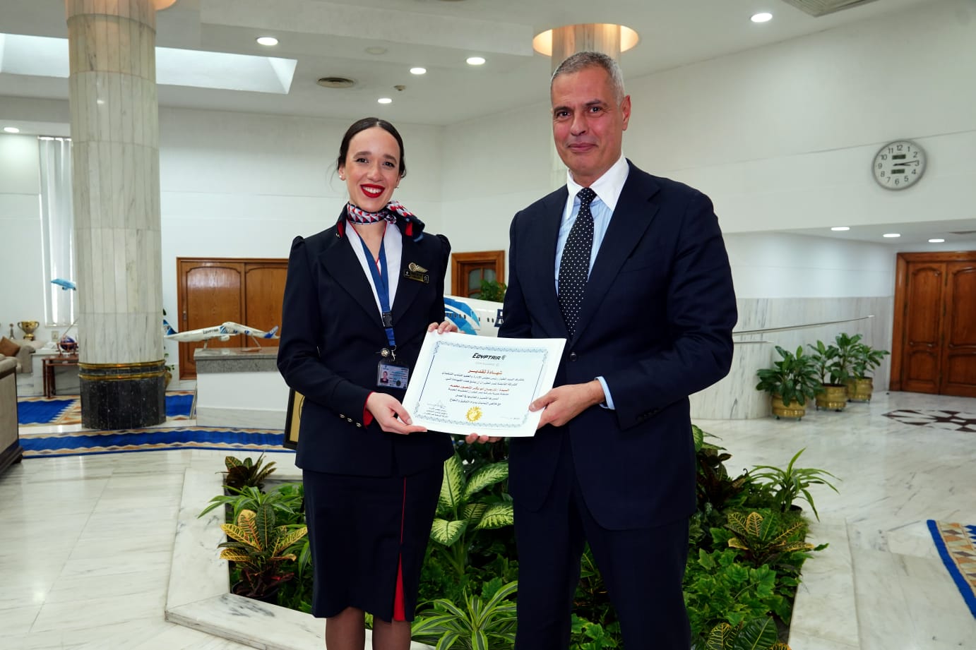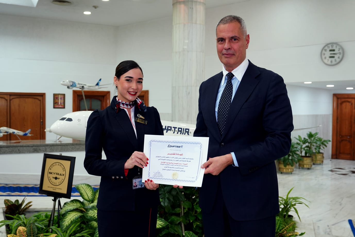 رئيس «مصر للطيران» يكرم طاقم الضيافة الجوية لموقفهم الإنساني في إحدى الرحلات