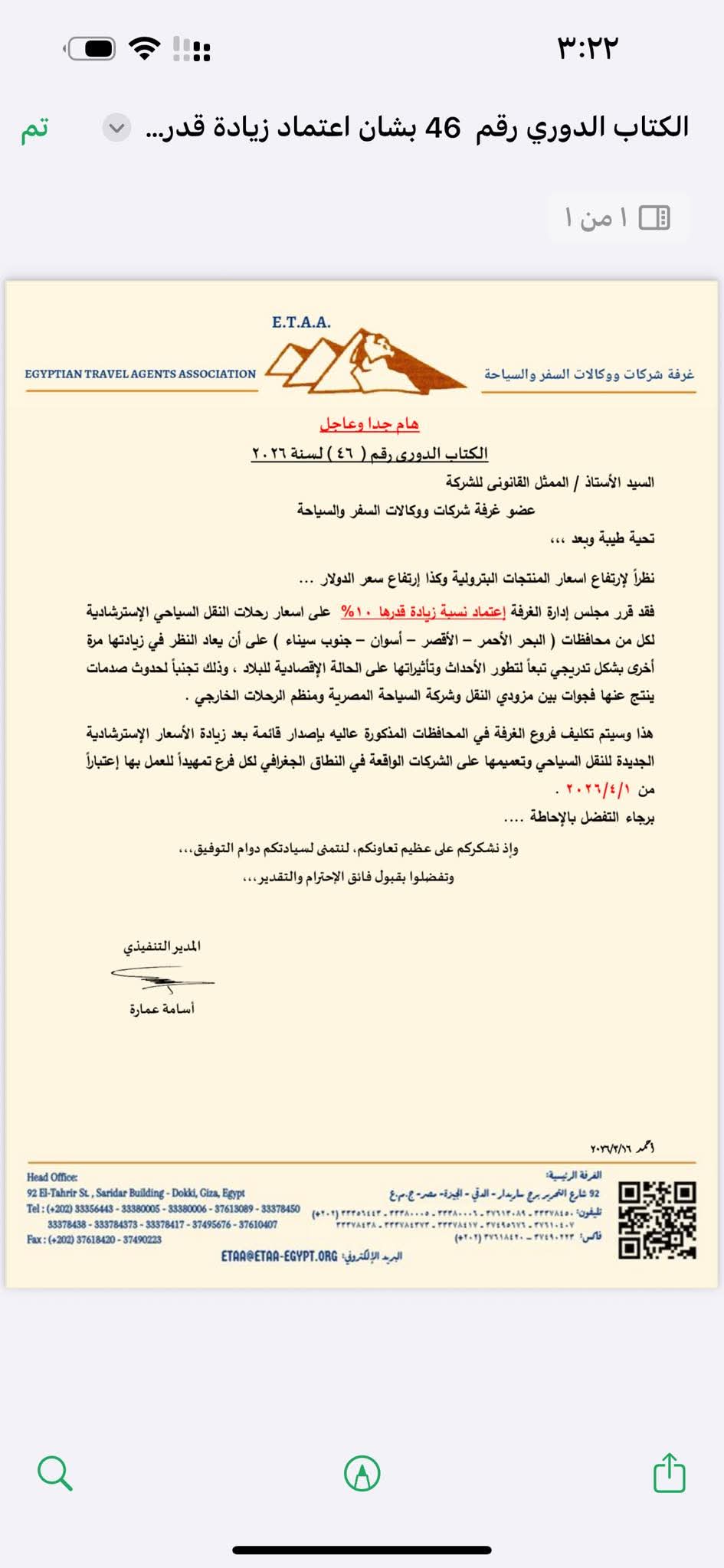 وأشارت إلي تكليف فروع الغرفة في المحافظات المذكورة، بإصدار قائمة بعد زيادة الأسعار الاسترشادية الجديدة للنقل السياحي، وتعميمها على الشركات الواقعة في النطاق الجغرافي لكل فرع تمهيدا للعمل بداية من 1 أبريل 2026.