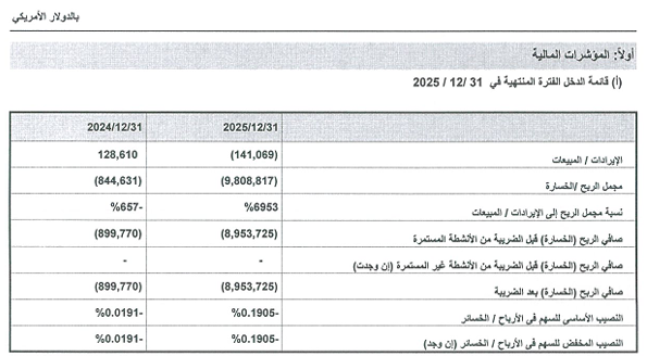 وأوضحت الشركة في الإفصاح المرسل للبورصة، أنها حققت خسائر بلغت 8.95 مليون دولار خلال الفترة من بداية يناير وحتى نهاية ديسمبر 2025، مقابل خسائر بقيمة 899.77 ألف دولار خلال 2024.