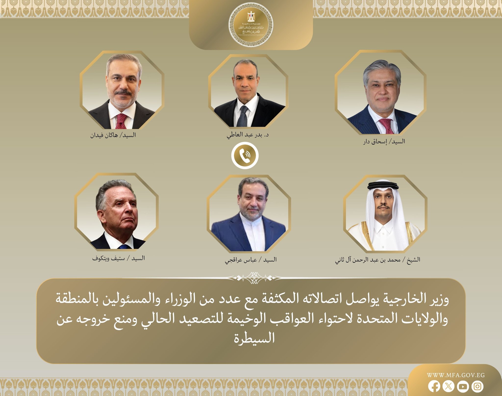 كما شارك السيد عباس عراقجي، وزير الخارجية الإيراني، والسيد ستيف ويتكوف، المبعوث الأمريكي الخاص للشرق الأوسط، يوم الأحد الـ22 من مارس، وذلك في إطار متابعة التطورات المتلاحقة في المنطقة، والمساعي الحثيثة المبذولة من مصر، من أجل خفض التصعيد ووقف الحرب.