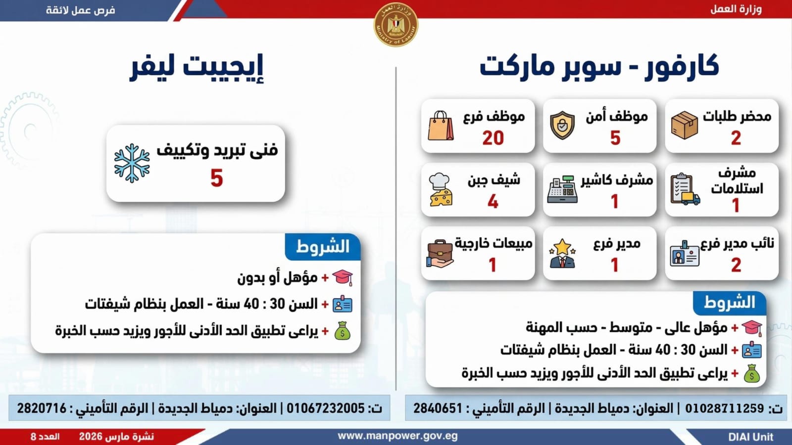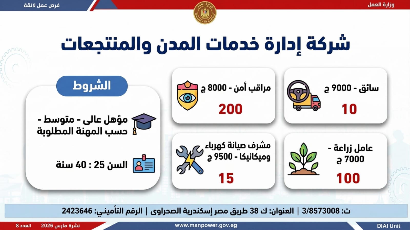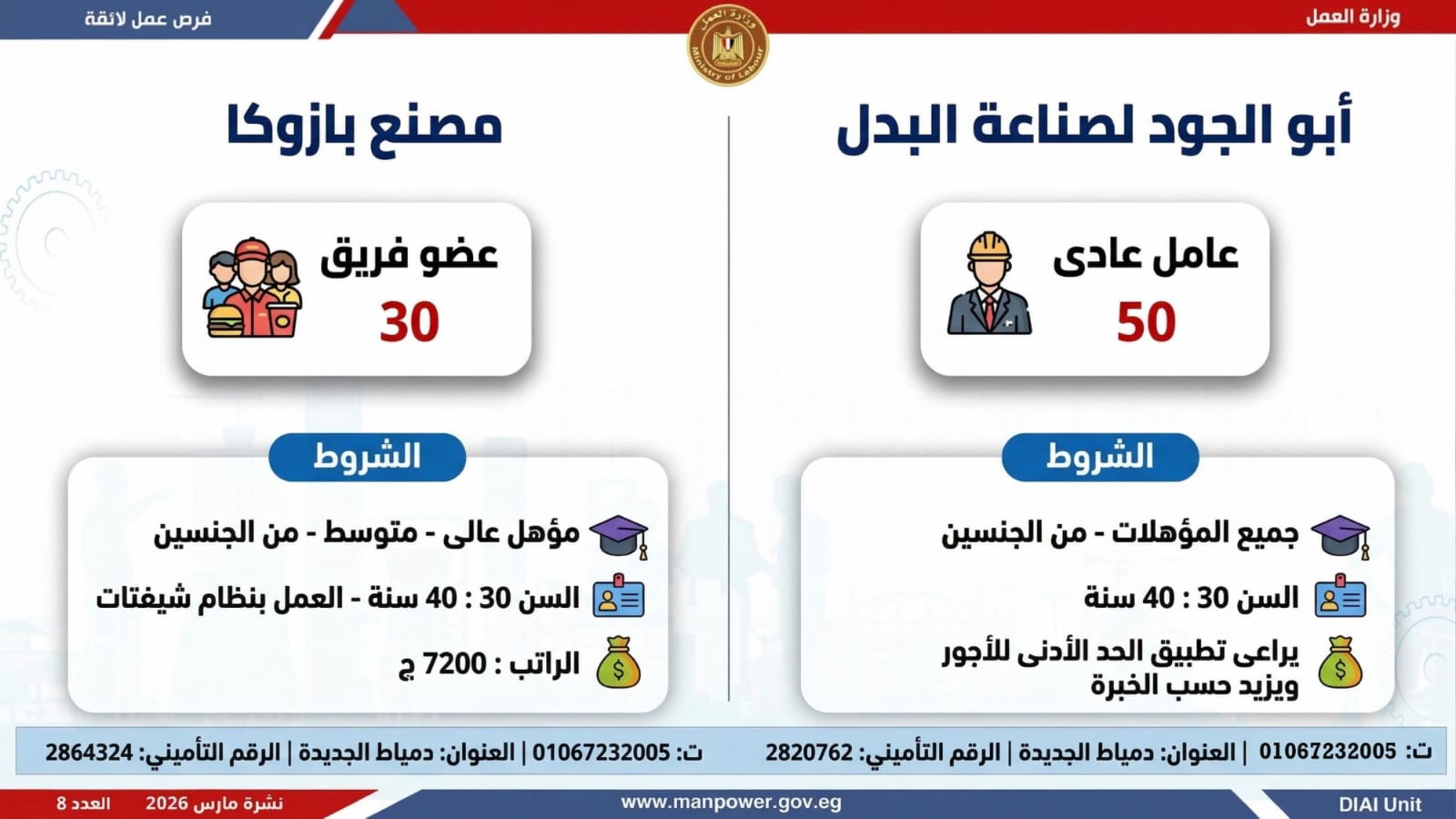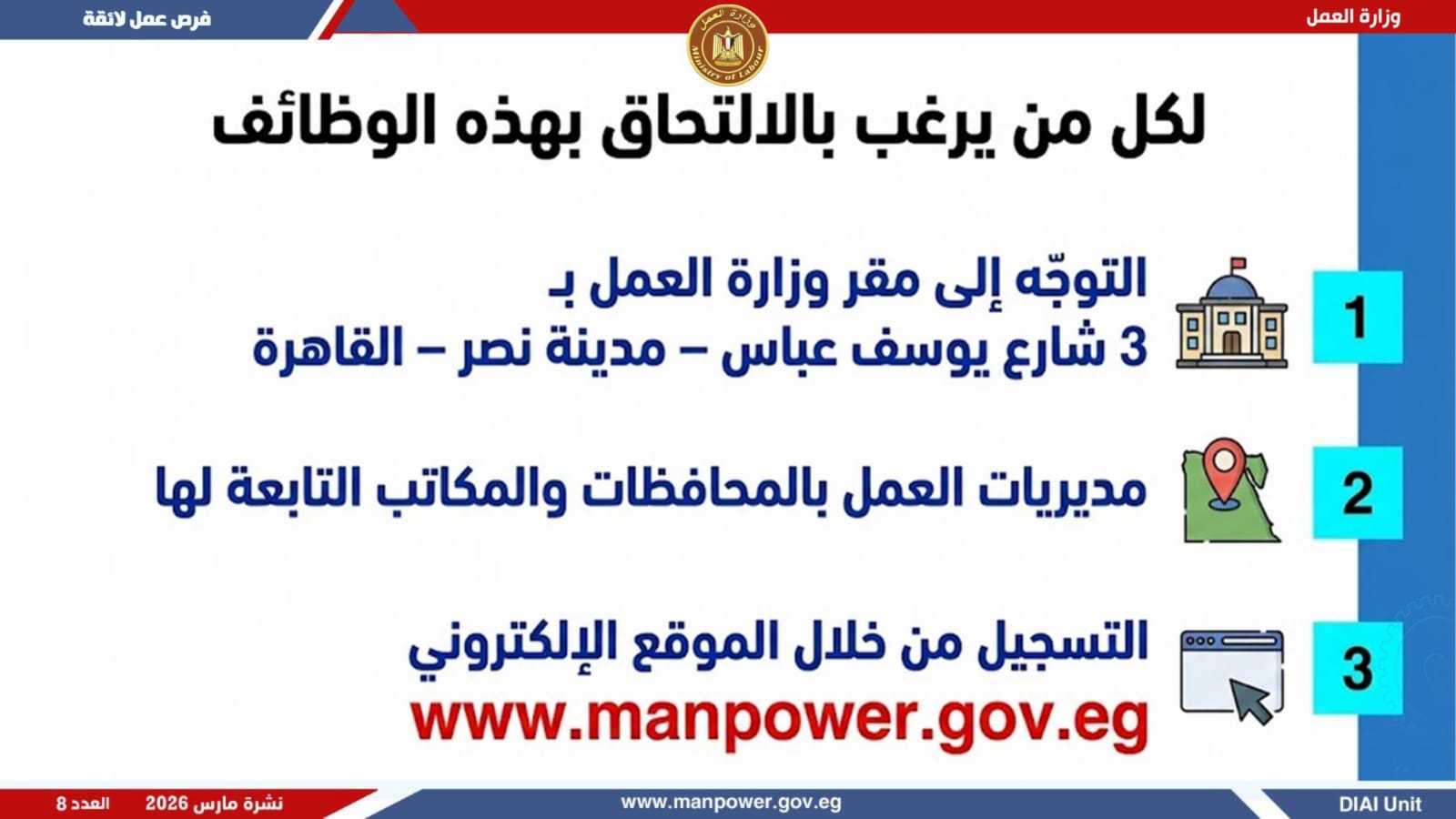 وأكدت الوزارة أن التقديم يتم عبر الإدارة العامة للتشغيل بمقر الوزارة القديم بمدينة نصر، أو من خلال مديريات العمل بالمحافظات، أو مباشرة عبر بيانات الشركات المرفقة بالنشرة، وكذلك من خلال الموقع الرسمي للوزارة، مشيرة إلى أن نشرة التوظيف تصدر بشكل أسبوعي، من خلال الإدارة العامة للتشغيل برئاسة هبة أحمد، وبإعداد منى شوقي – باحث أول بالإدارة، وتتضمن أحدث الفرص المتوفرة على مستوى الجمهورية، نتاج تعاون مشترك بين مديريات العمل والقطاع الخاص بالمحافظات.