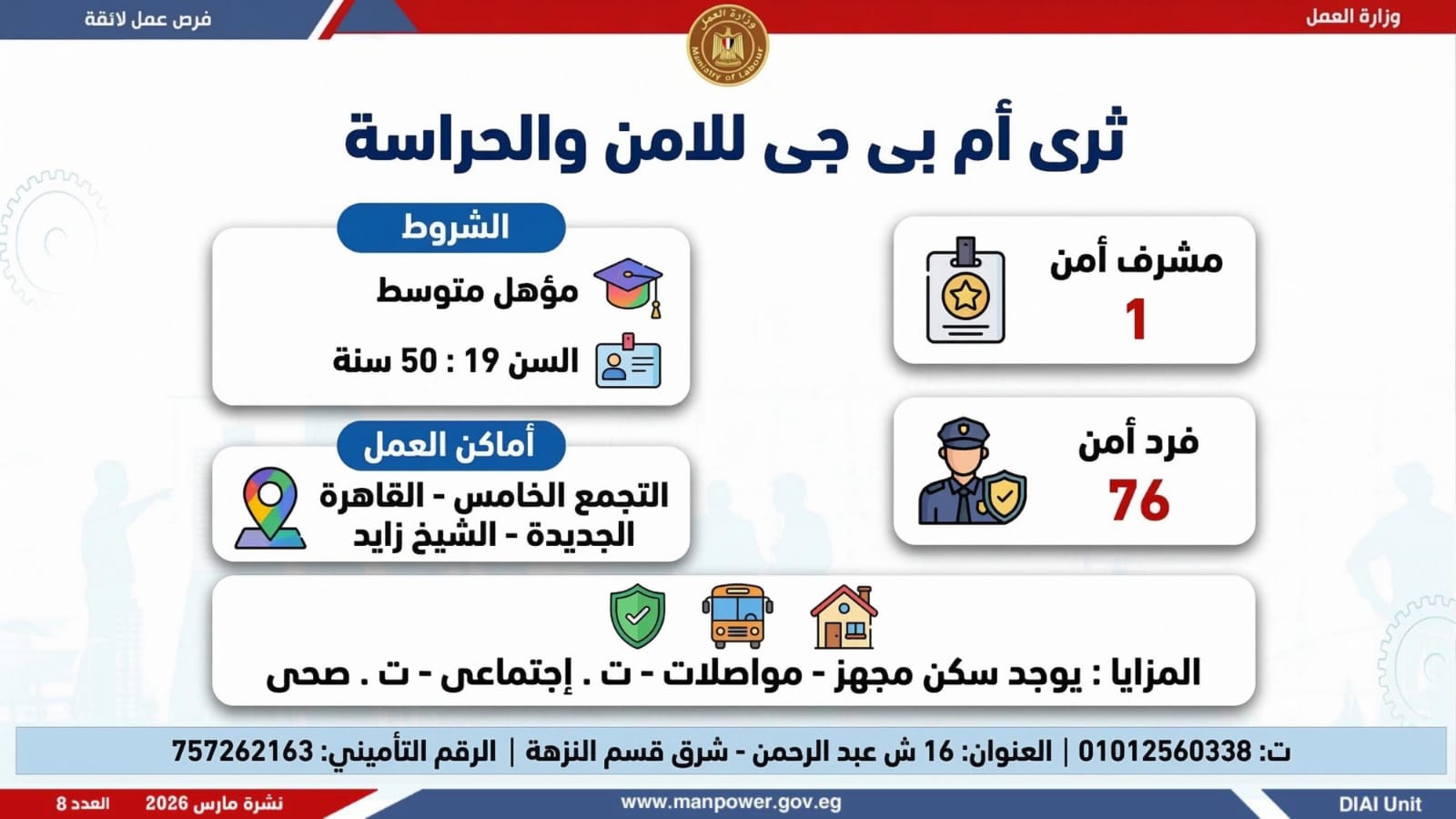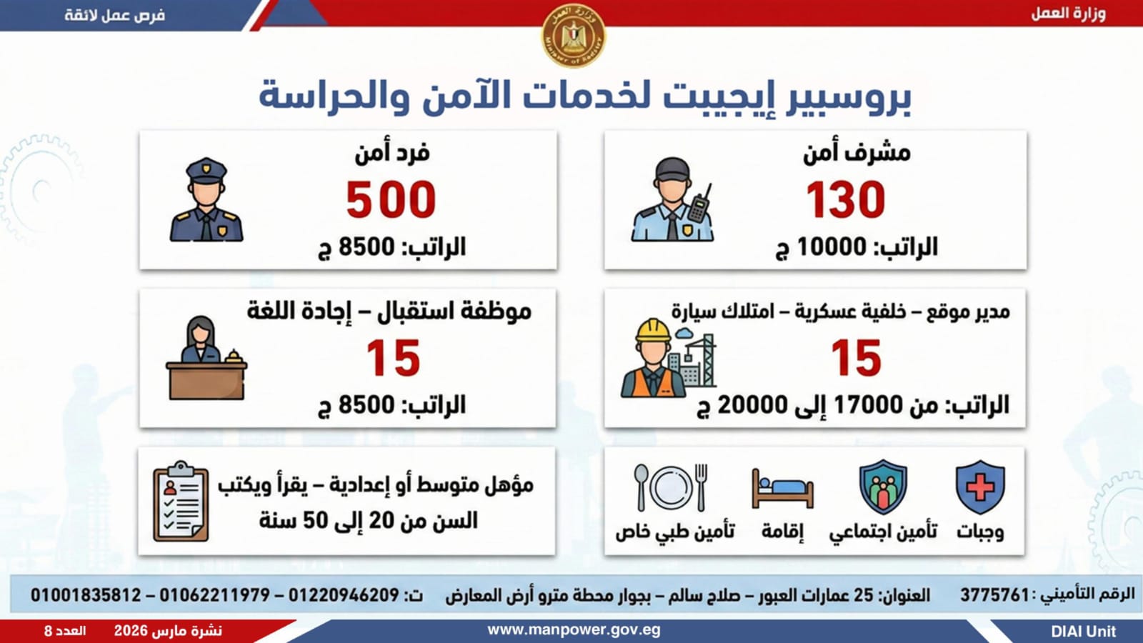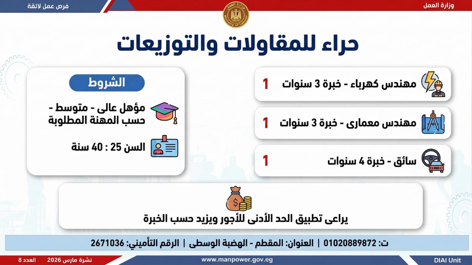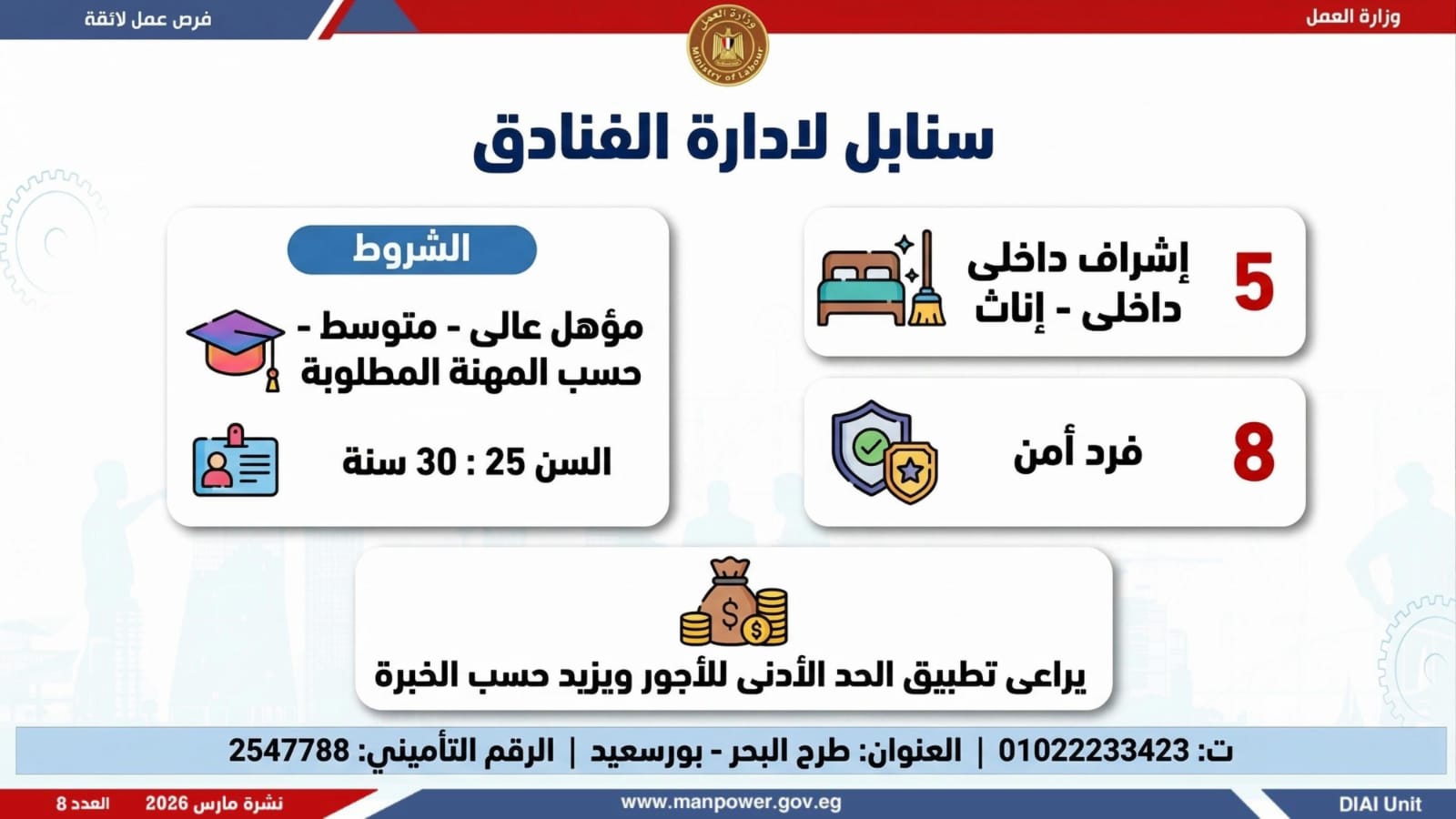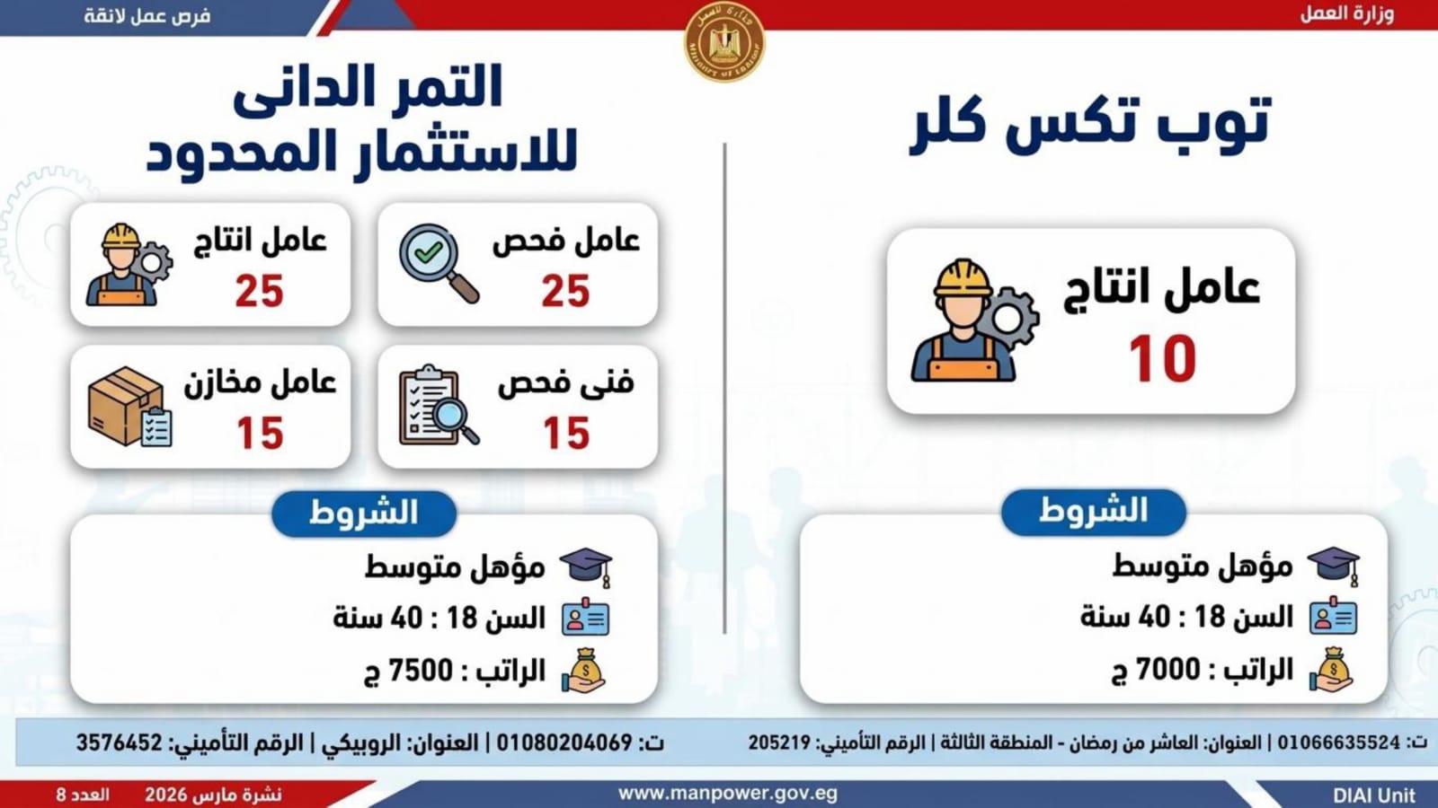 وأكدت الوزارة أن التقديم يتم عبر الإدارة العامة للتشغيل بمقر الوزارة القديم بمدينة نصر، أو من خلال مديريات العمل بالمحافظات، أو مباشرة عبر بيانات الشركات المرفقة بالنشرة، وكذلك من خلال الموقع الرسمي للوزارة، مشيرة إلى أن نشرة التوظيف تصدر بشكل أسبوعي، من خلال الإدارة العامة للتشغيل برئاسة هبة أحمد، وبإعداد منى شوقي – باحث أول بالإدارة، وتتضمن أحدث الفرص المتوفرة على مستوى الجمهورية، نتاج تعاون مشترك بين مديريات العمل والقطاع الخاص بالمحافظات.