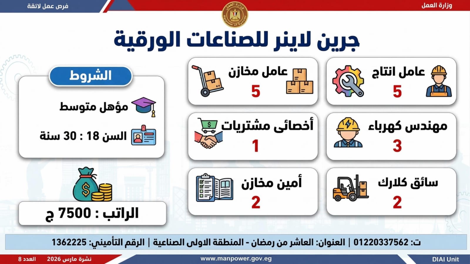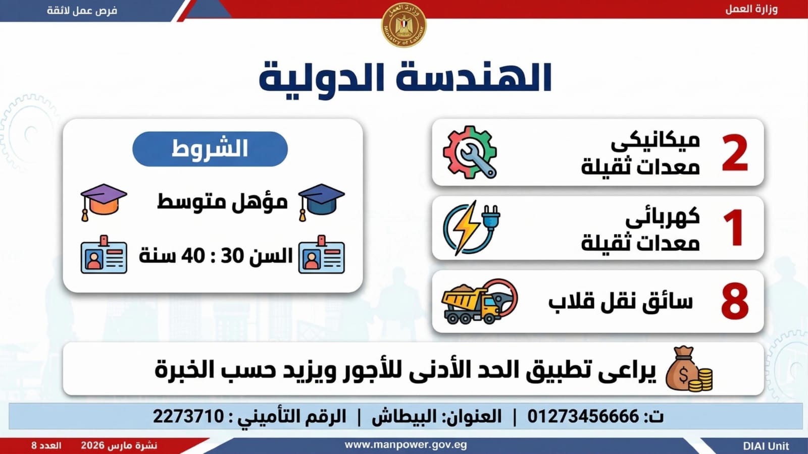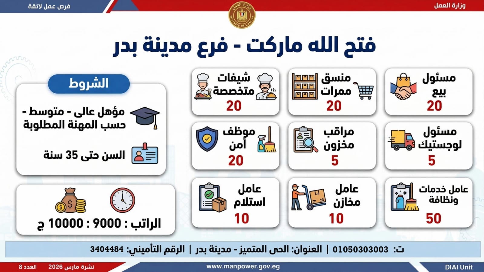 وبيّنت الوزارة في بيان لها أن النشرة تضم فرصًا متنوعة في عشرات التخصصات والمهن، برواتب مجزية تُحدد وفق طبيعة الوظيفة والمقابلة الشخصية، مع التزام كامل بتطبيق الحد الأدنى للأجور، والاستفادة من مظلة التأمينات الاجتماعية والصحية، بما يضمن بيئة عمل آمنة ومستقرة تحفظ كرامة العامل وتصون حقوقه، كما تشمل النشرة فرصًا مخصصة لذوي الهمم في إطار سياسة دمجهم في سوق العمل.