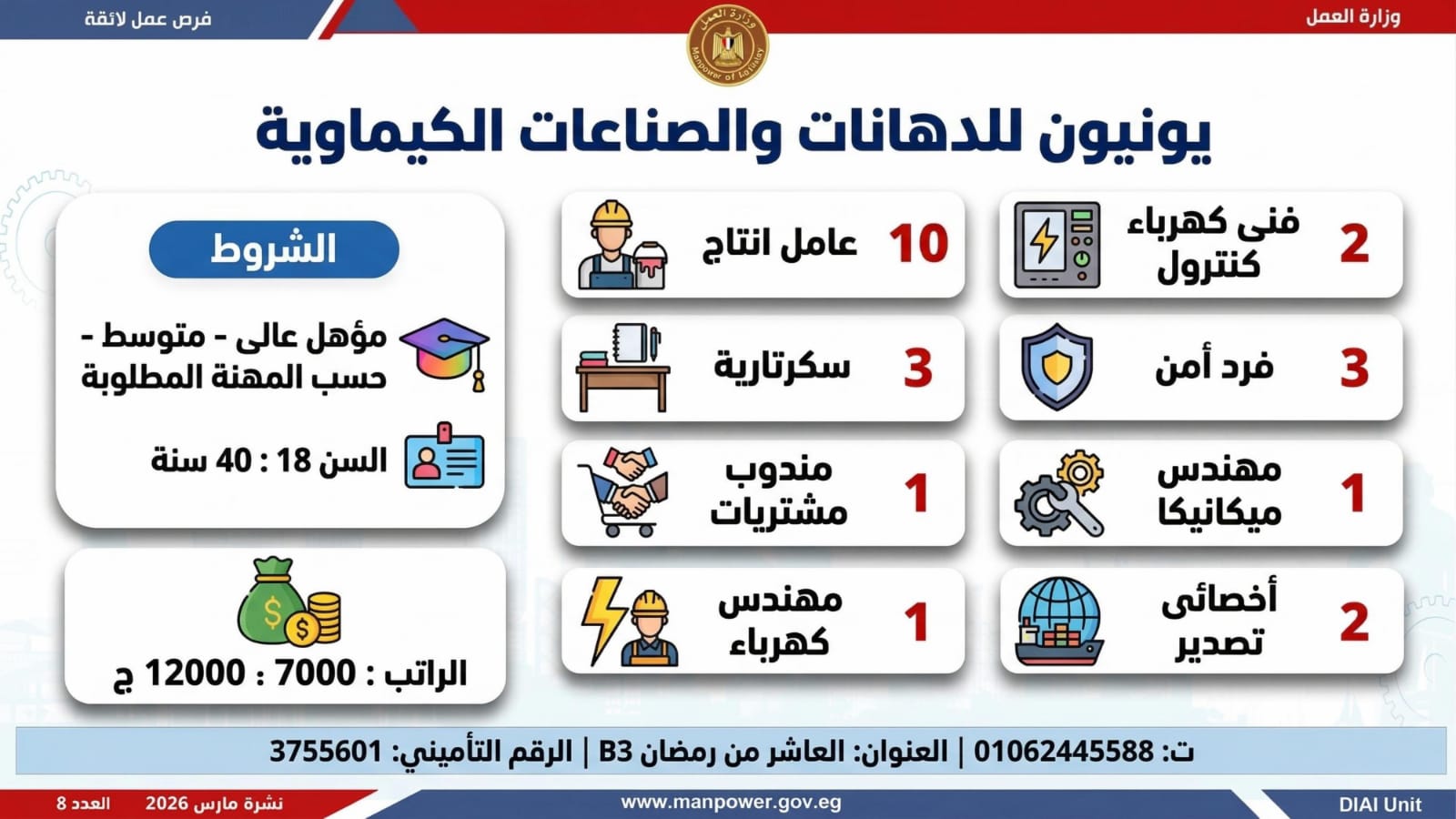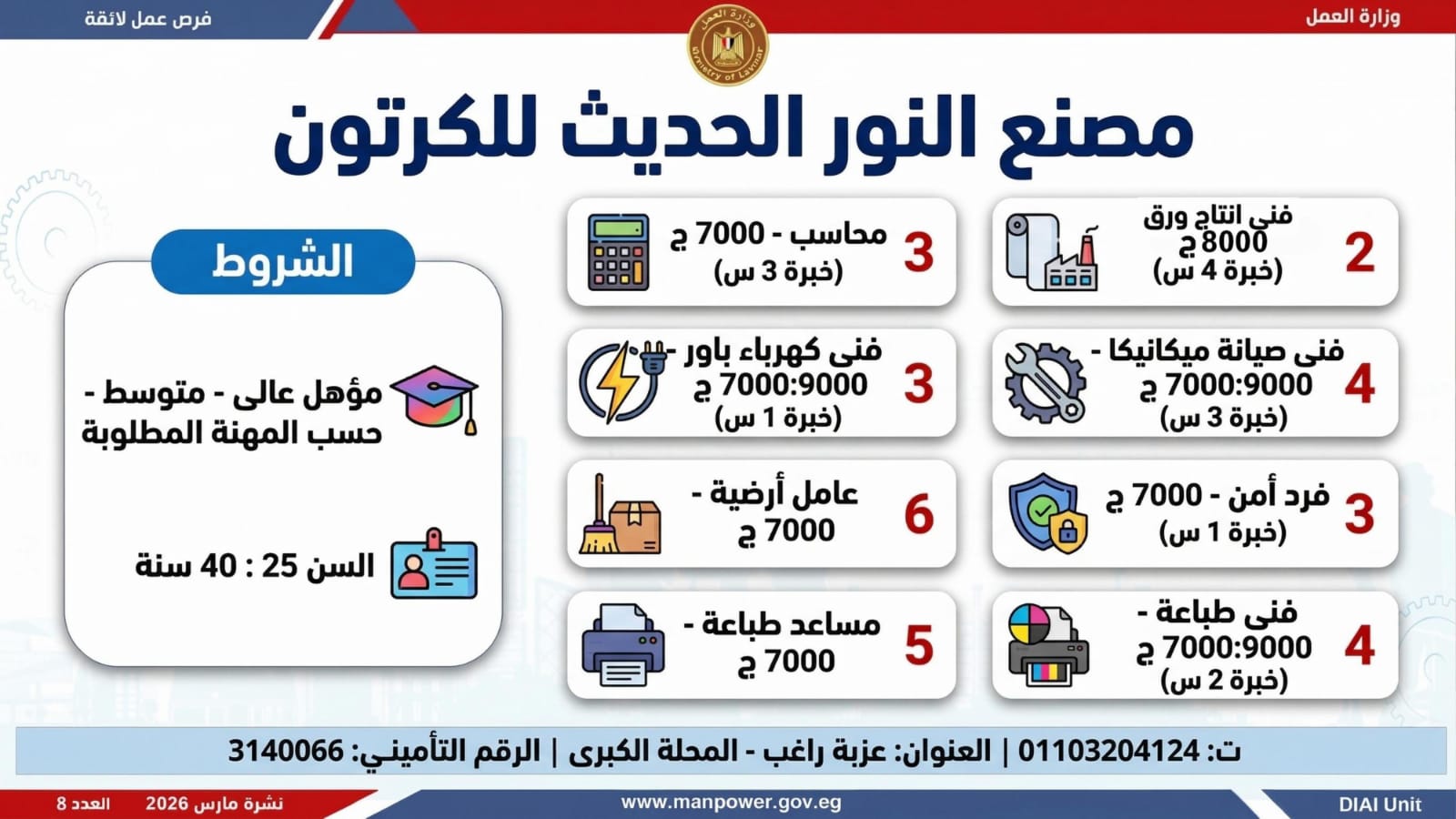 أعلنت وزارة العمل اليوم الاثنين، إطلاق نشرة التوظيف الأسبوعية متضمنة 2289 فرصة عمل، بالتعاون مع 34 شركة من شركات القطاع الخاص، موزعة على 9 محافظات، مع فتح باب التقديم خلال شهر مارس 2026 الحالي.