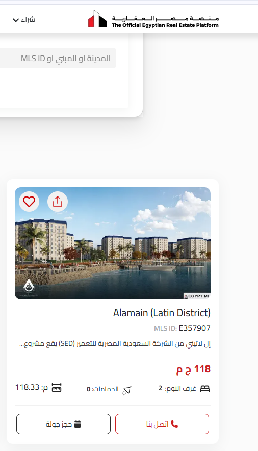 الوحدة المطروحة عبر منصة مصر العقارية، في مشروع تابع للشركة السعودية المصرية للتعمير (SED)، وموجودة فى الحي اللاتيني بقلب مدينة العلمين الجديدة، ومساحتها 118 متر، والسعر الإجمالي المطروح 118 جنيه مصري، وهو ما قد يكشف عن خطأ فى كتابة السعر أو ربما حيله من المطور العقاري لجذب زوار المنصة والعملاء، وإليكم صورة مفصلة من الإعلان المنشور على المنصة.