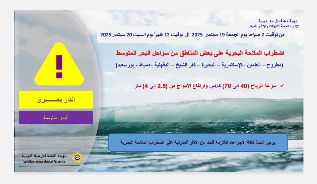 أعلنت الهئية العامة للأرصاد الجوية، أنه اعتبارًا من الساعة الـ2 صباحًا من يوم الجمعة الموافق للـ19 من سبتمبر 2025، سيحدث اضطراب الملاحة البحرية على بعض المناطق من سواحل البحر المتوسط التي منها:- (مطروح - العلمين - الإسكندرية - البحيرة - كفر الشيخ - الدقهلية - دمياط - بورسعيد)، والتي من المقرر أن تستمر حتى الساعة الـ12 ظهرًا يوم السبت، الموافق للـ20 من سبتمبر 2025.