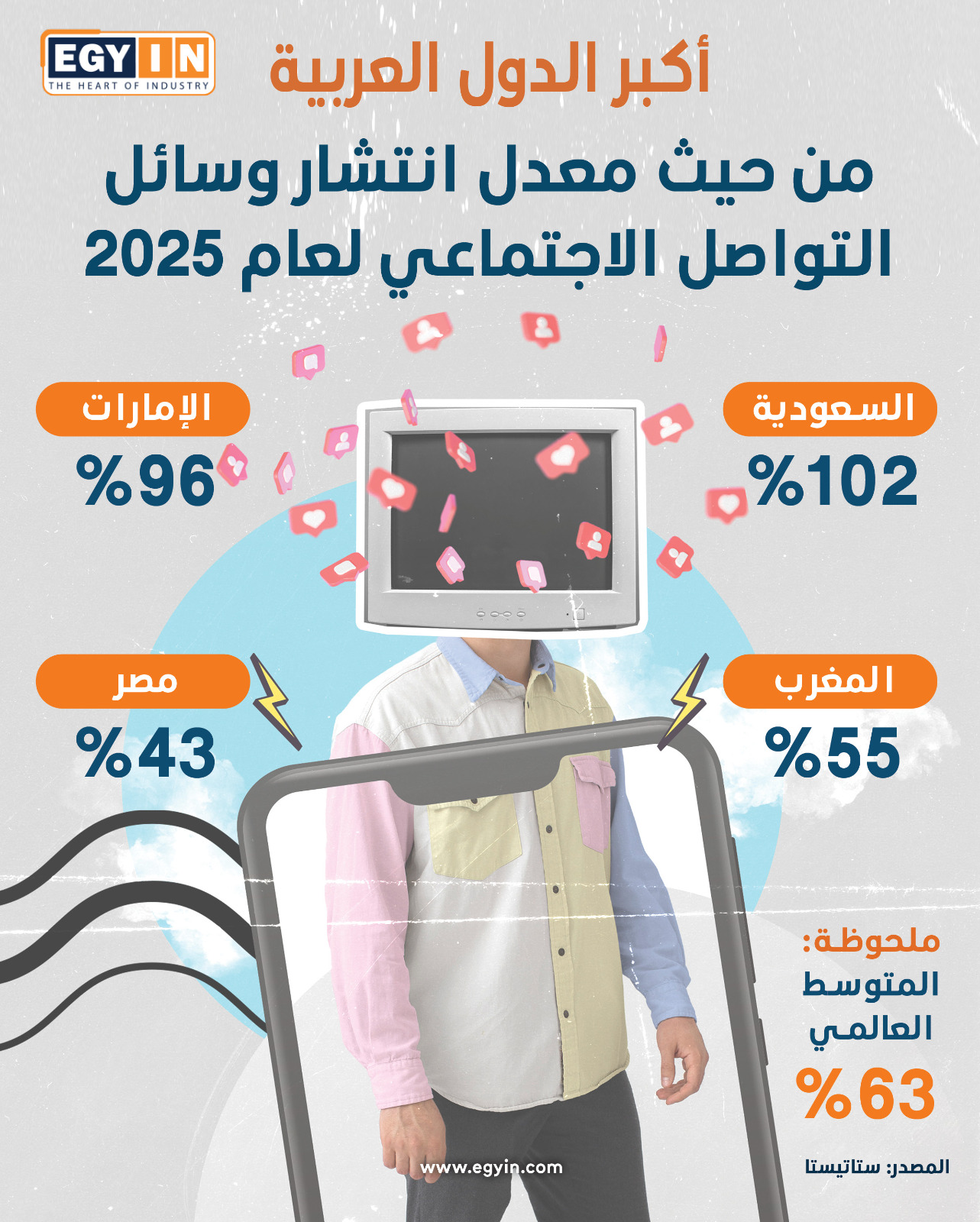 أكبر الدول العربية في معدل انتشار وسائل التواصل الاجتماعي 2025 (انفوجراف)