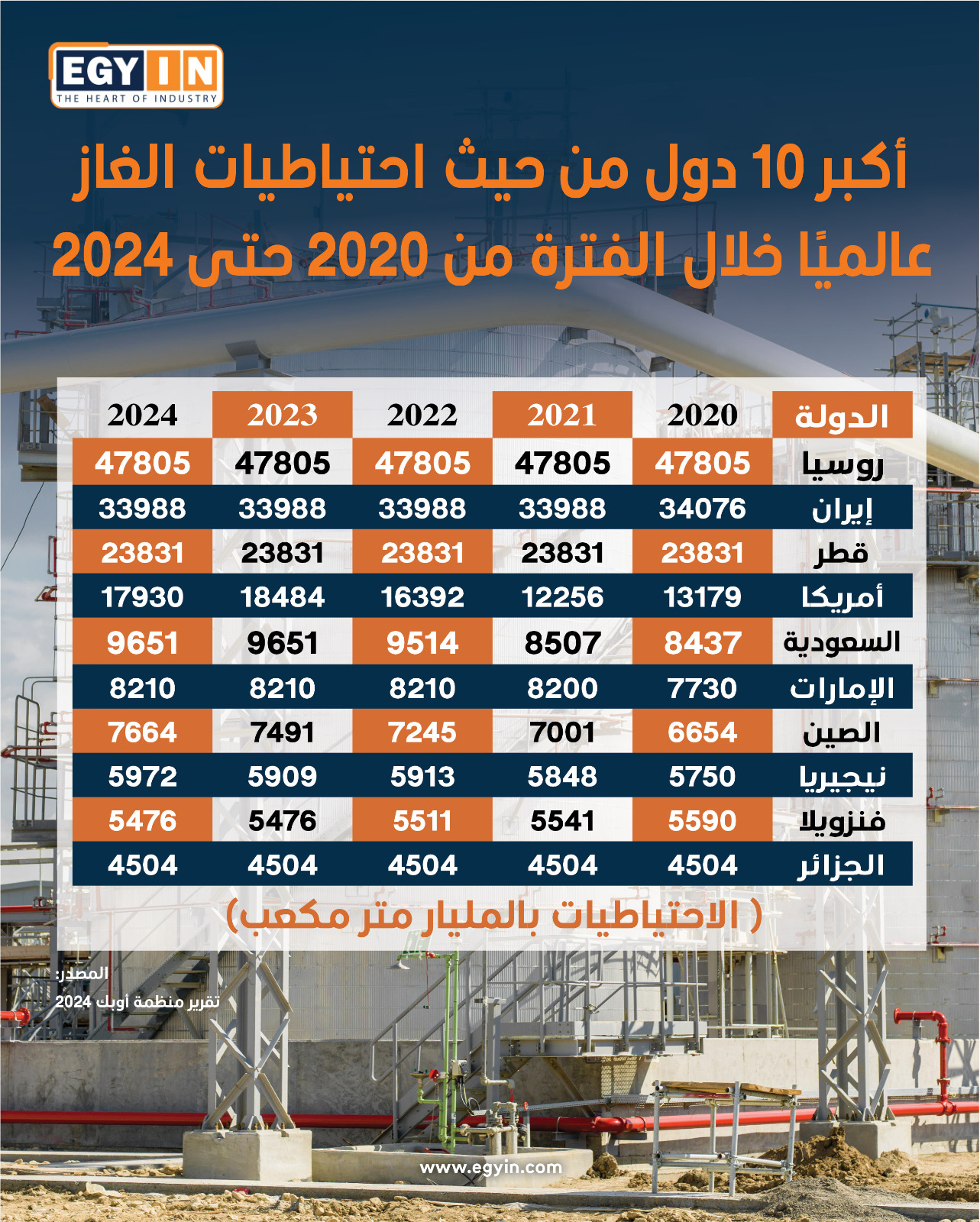 أكبر 10 دول من حيث احتياطيات الغاز عالميًا خلال الفترة من 2020 حتى 2024 ( الاحتياطيات بالمليار متر مكعب)