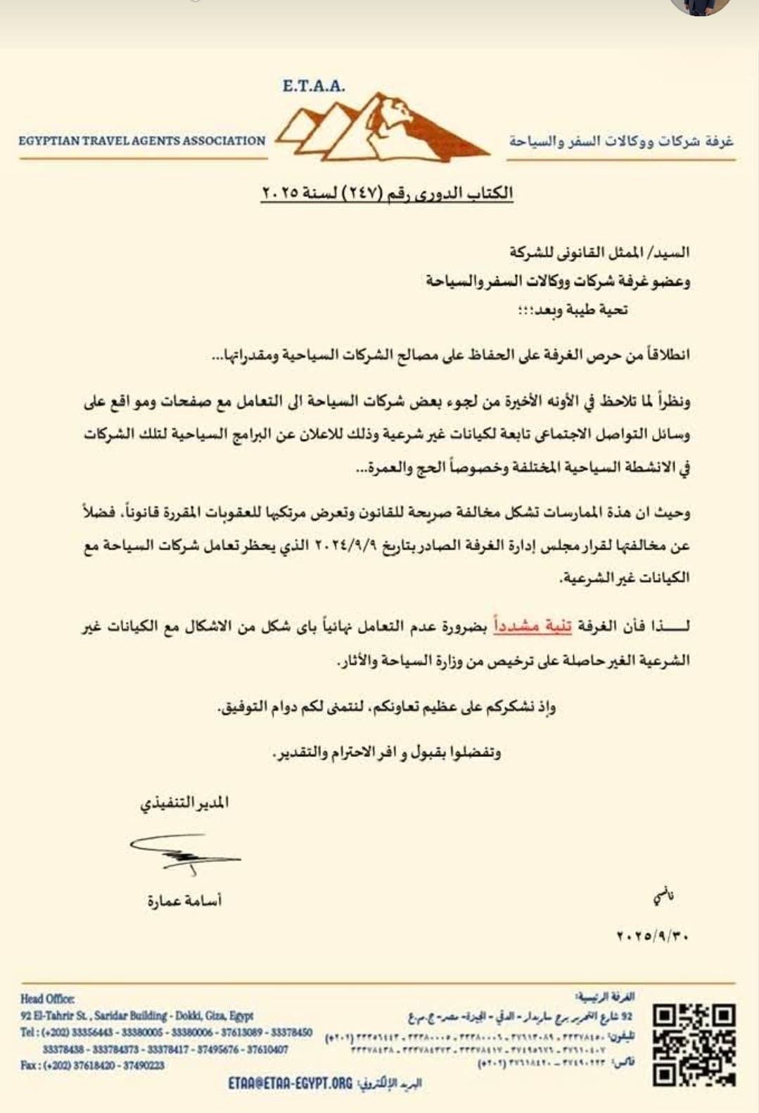 وأوضحت غرفة شركات السياحة، في منشور داخلي حمل رقم 247 لسنة 2025 حصل موقع "إيجي إن" على نسخة منه، أن هذه الممارسات تشكل مخالفة صريحة للقانون وتعرض مرتكبها للعقوبات المقررة قانونًا، إضافة إلى مخالفتها لقرار مجلس إدارة الغرفة، الصادر بتاريخ الـ9 من سبتمبر 2024، والذى يحظر تعامل شركات السياحة مع الكيانات غير الشرعية.