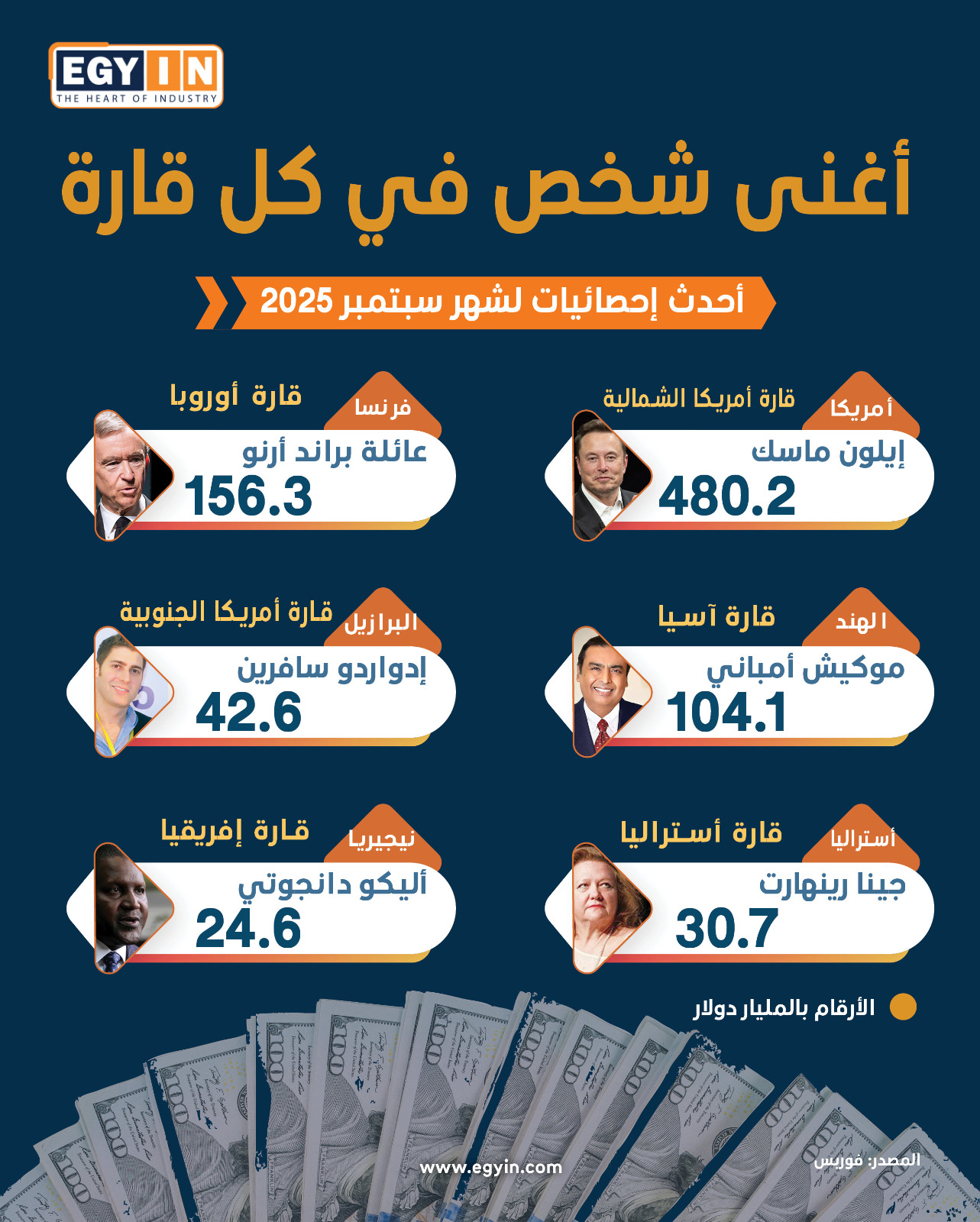 تعرف على أغنى شخص في كل قارة لشهر سبتمبر 2025 (انفوجراف)