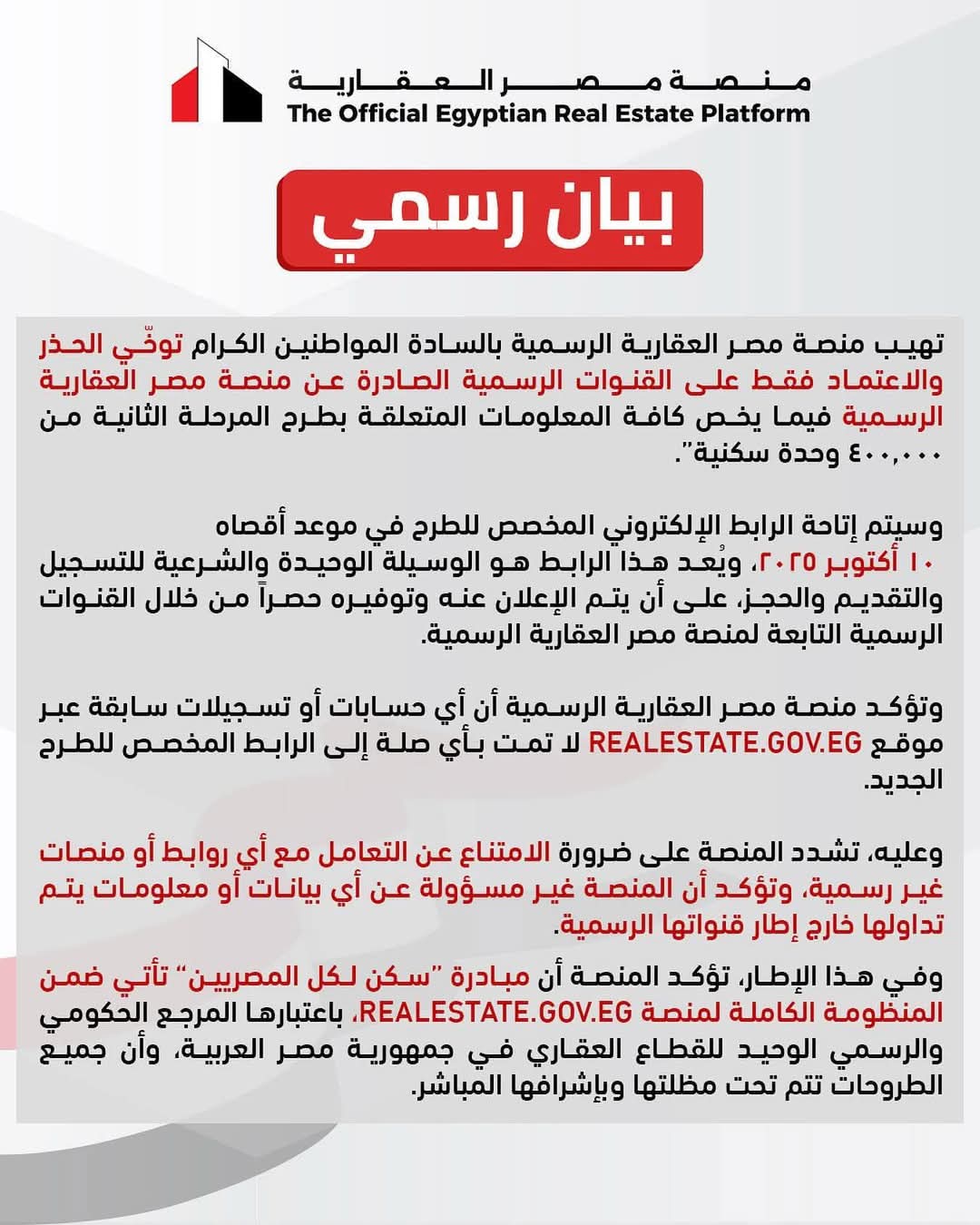 وأضاف الموقع الرسمي: «بناءً على التنسيق المشترك والاتفاق المبرم مع وزارة الإسكان وهيئة المجتمعات العمرانية، تقرر رسميًا موعد بدء الطرح السكني الجديد لعام 2025، سيتم إطلاق الطرح في التاريخ الجديد الموافق يوم 10 / 10 / 2025، في تمام الساعة العاشرة صباحًا، وسيتم الحجز من خلال منصة مصر العقارية الرسمية، وللمزيد من التفاصيل يرجى متابعتنا على مواقع التواصل الاجتماعي».