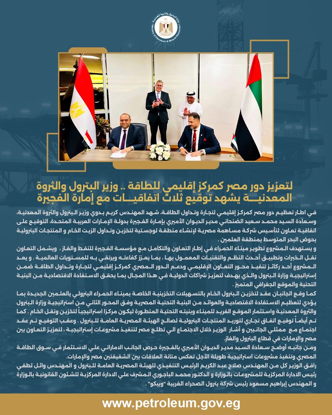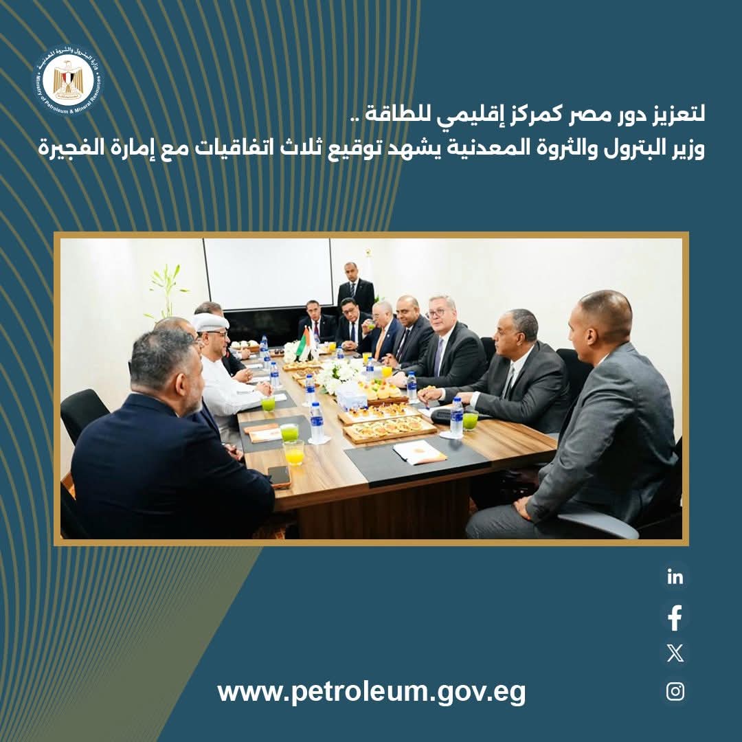 وذلك بحضور المهندس كريم بدوي وزير البترول والثروة المعدنية، ومحمد سعيد الضنحاني، مدير الديوان الأميري بإمارة الفجيرة بدولة الإمارات العربية المتحدة.