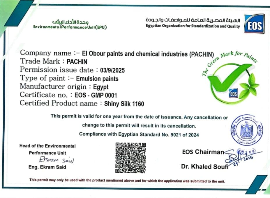قامت الهيئة المصرية العامة للمواصفات والجودة، بتسليم أول علامة خضراء للدهانات، لشركة العبور للبويات والصناعات الكيماوية «باكين» عن منتجها شايني سيلك 1160، لتصبح بذلك أول شركة مصرية تنجح في الحصول على هذه العلامة الخضراء، والتي تعد أداة هامة لتشجيع الصناعات الوطنية على التحول نحو الإنتاج المستدام، وتقديم منتجات آمنة وصديقة للبيئة تتوافق مع التوجهات العالمية في مواجهة التغيرات المناخية.