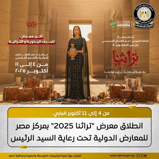 تشهد مصر، غدًا السبت، انطلاق معرض تراثنا، والمقام في الفترة من 4 إلى 11 أكتوبر، أضخم حدث يروج للمشروعات الحرفية والتراثية، بالتنسيق بين الحكومة المصرية والقطاع الخاص والمجتمع المدني، عبر تنظيم النسخة السابعة من معرض تراثنا.