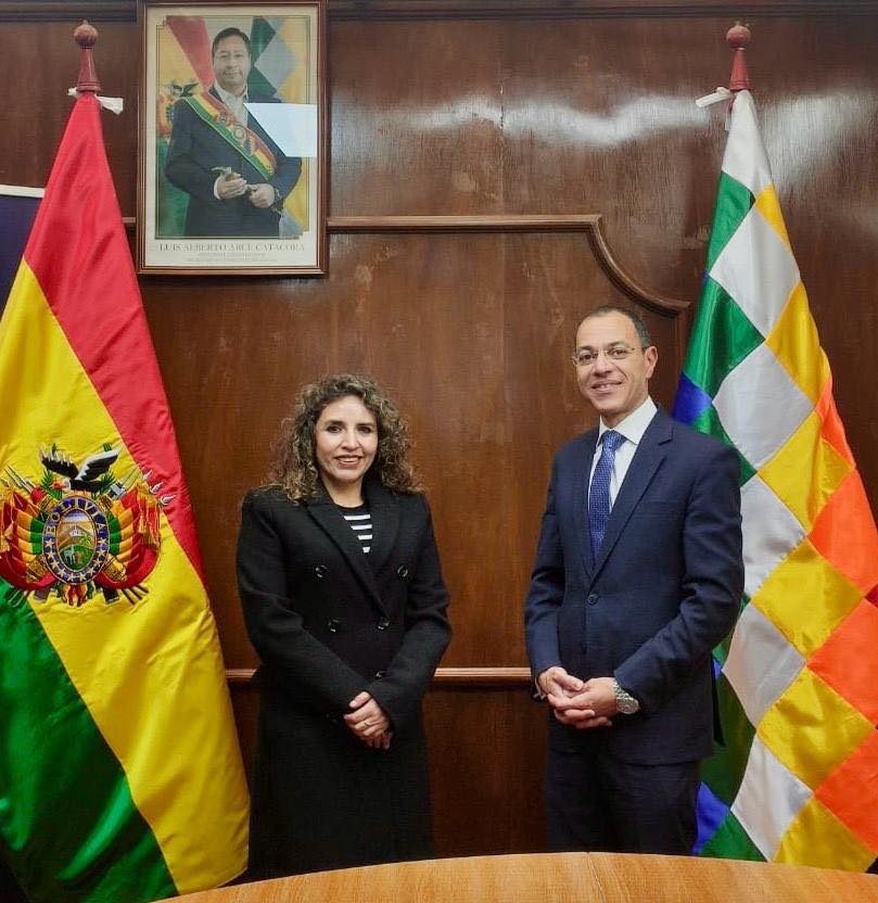 التقى السفير حاتم النشار، سفير جمهورية مصر العربية في لاباز، ماريا رينيه كاسترو، وزيرة الصحة البوليفية، وذلك في إطار تعزيز التعاون الثنائي بين مصر وبوليفيا في المجال الصحي.