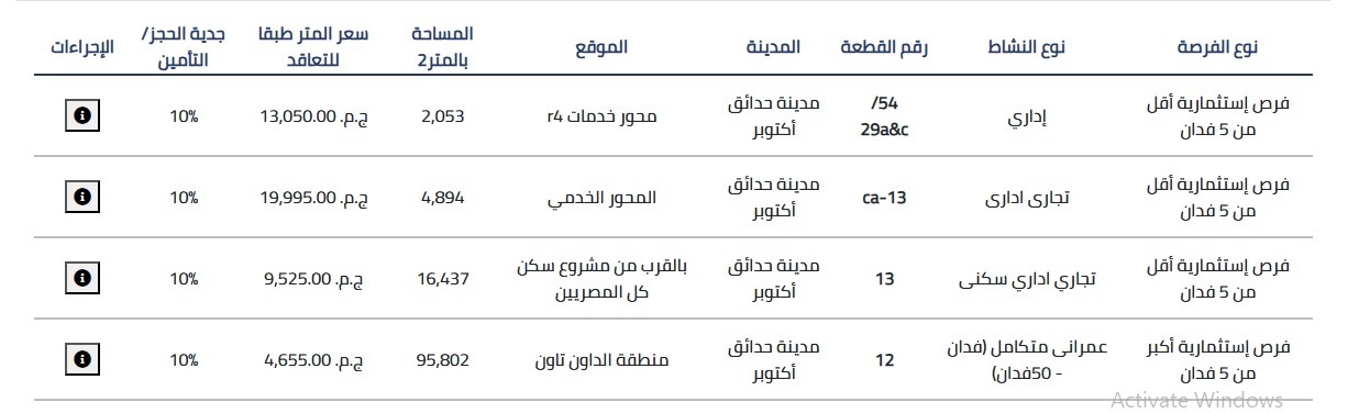 1ـ قطعة أرض بمساحة 2053 متر بنشاط إداري بمنطقة محور خدمات آر 4 بسعر 13050 للمتر، وبنسبة جدية حجز 10% .