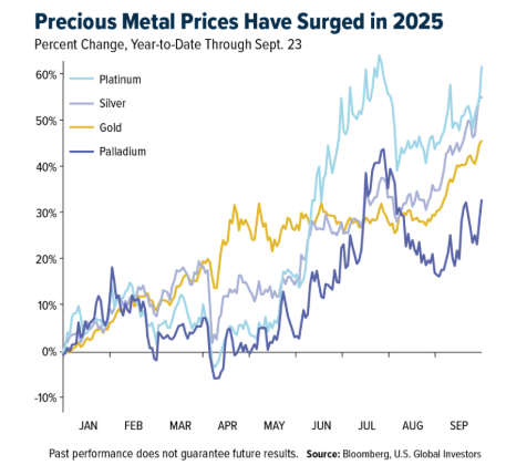 وأوضح "فرانك هولمز" أنه لا يقتصر الأمر على الذهب فحسب، بل شهدت أسعار الفضة والبلاتين والبلاديوم ارتفاعًا حادًا هذا العام، فقد ارتفعت أسعار الفضة بأكثر من 50%، والبلاتين 65%، والبلاديوم 35%.
