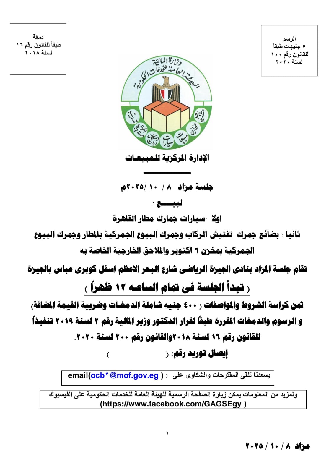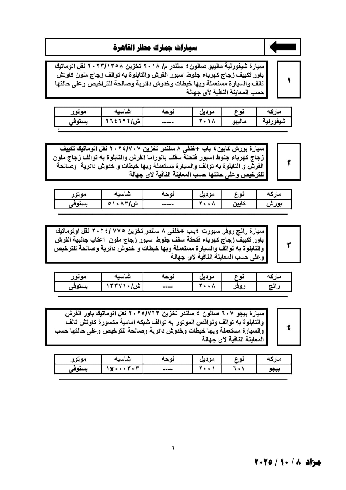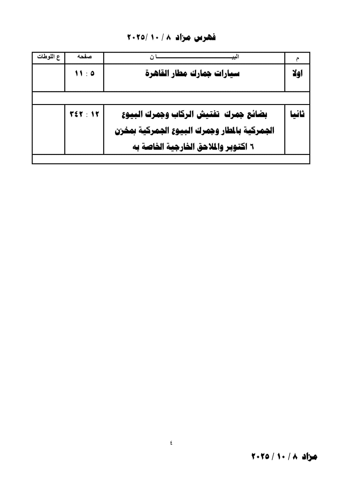 تعقد فى الثانية عشرة من ظهر يوم الأربعاء الموافق 8 أكتوبر 2025 بقاعة نادى الجيزة الرياضى شارع البحر الأعظم أسفل كوبرى عباس بالجيزة جلسة المزاد العلني المقررة لبيع عدد من لوطات السيارات والبضائع بجمارك مطار القاهرة وتفتيش الركاب ومخزن 6 أكتوبر والملاحق الخاصة به.