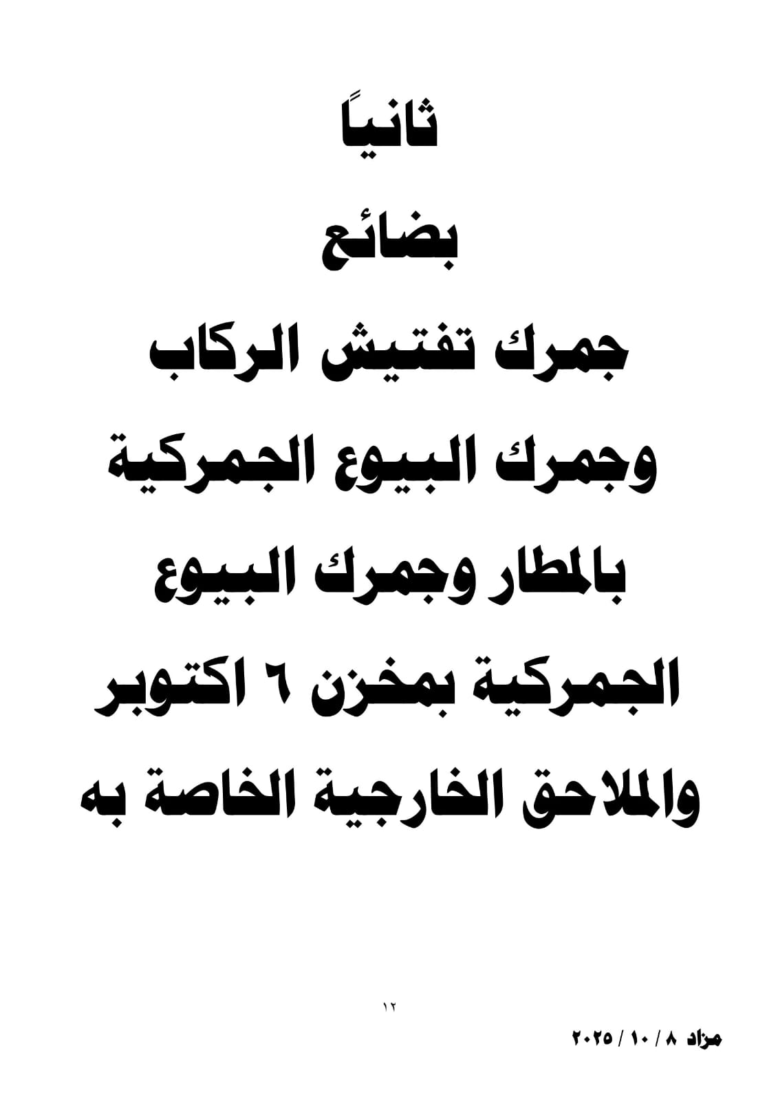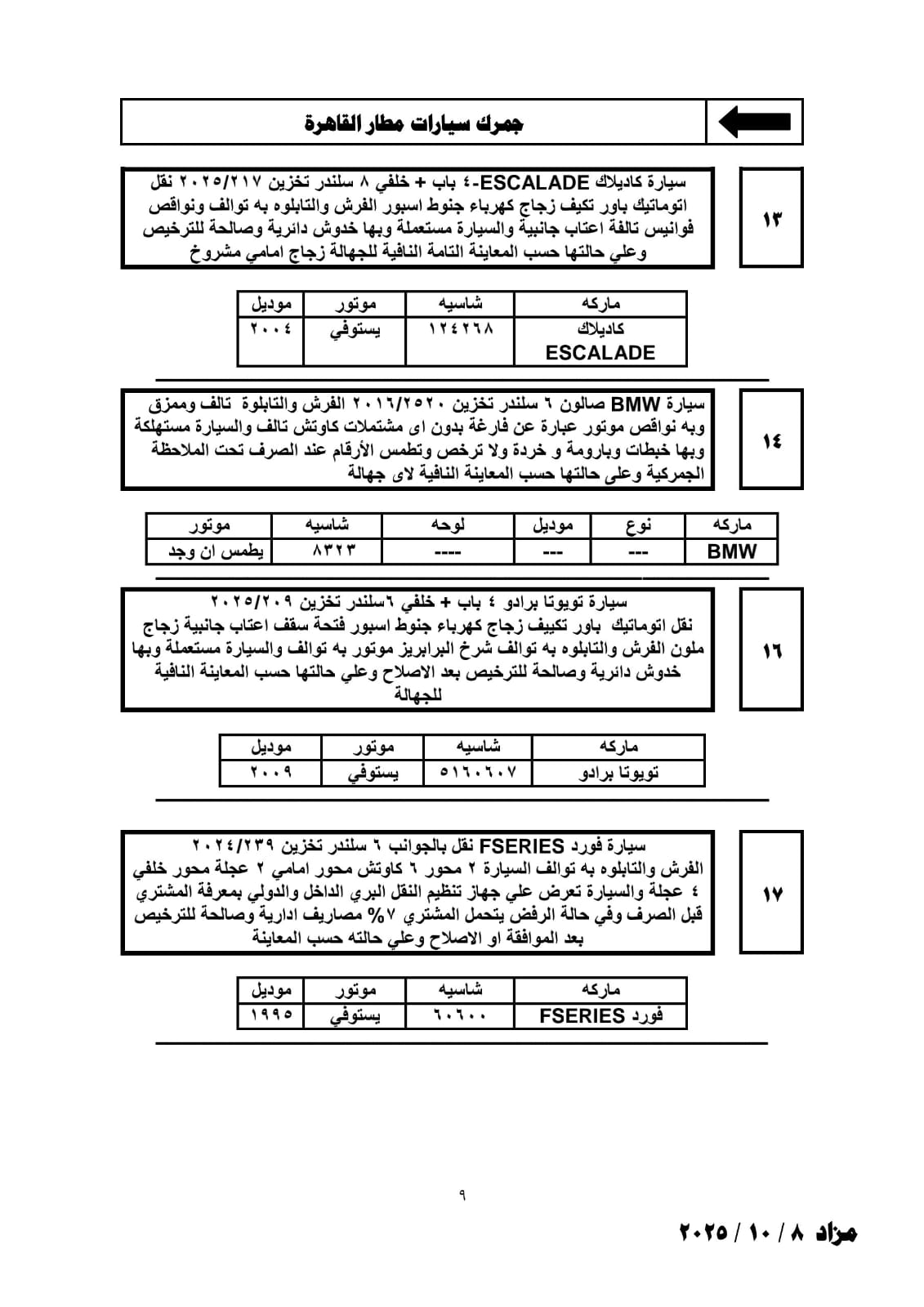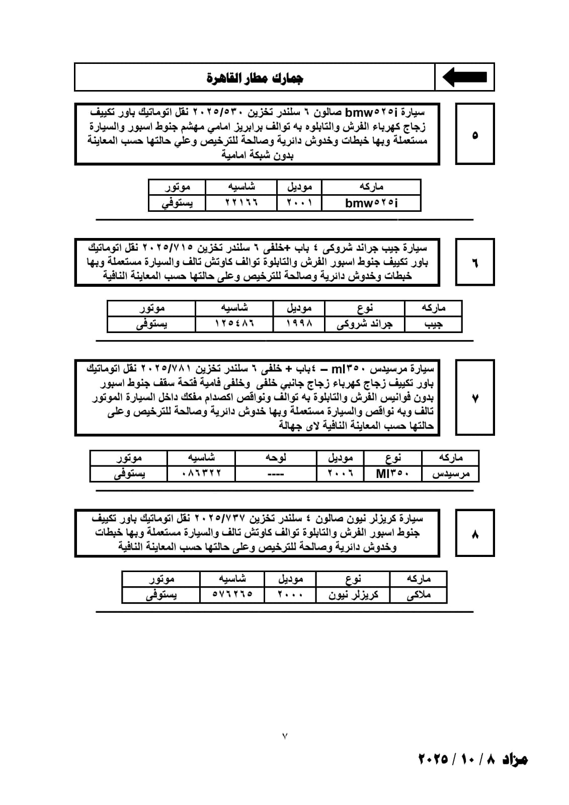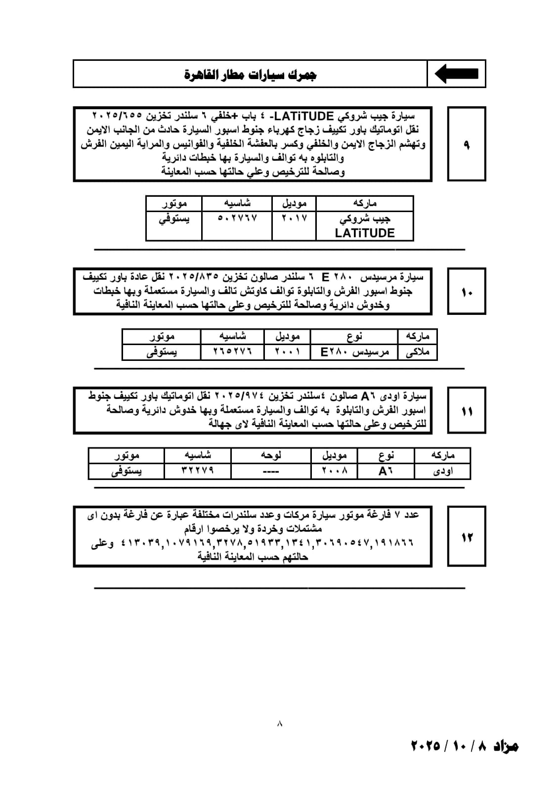 تعقد فى الثانية عشرة من ظهر يوم الأربعاء الموافق 8 أكتوبر 2025 بقاعة نادى الجيزة الرياضى شارع البحر الأعظم أسفل كوبرى عباس بالجيزة جلسة المزاد العلني المقررة لبيع عدد من لوطات السيارات والبضائع بجمارك مطار القاهرة وتفتيش الركاب ومخزن 6 أكتوبر والملاحق الخاصة به.