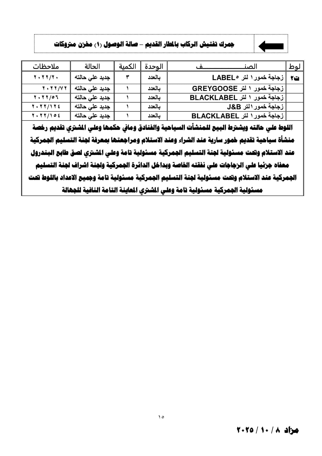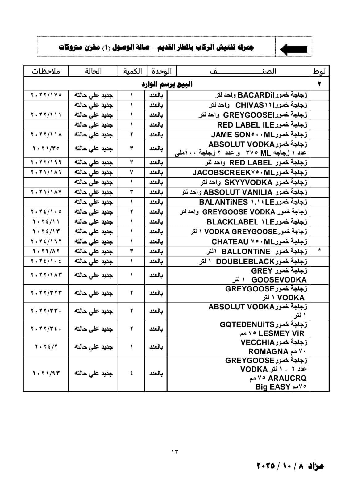 بضائع مخزنة بجمارك تفتيش الركاب والبيوع الجمركية بمطار القاهرة ومخزن 6 اكتوبر والملاحق الخاصة