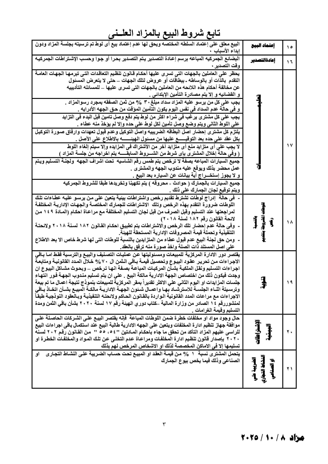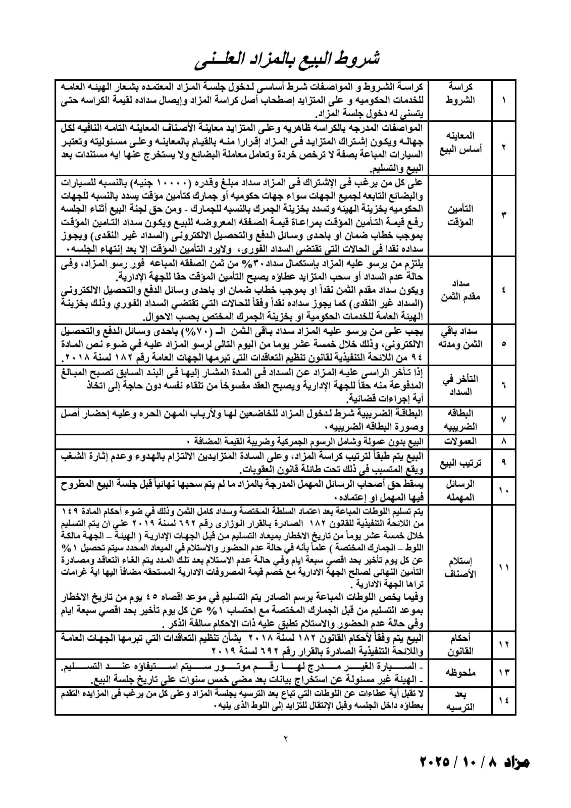 ويتم البيع وفقا لأحكام القانون رقم 182 لسنة 2018 بشأن تنظيم التعاقدات التى تبرمها الجهات العامة ولائحته التنفيذية الصادرة بالقرار 692 لسنة 2019 وطبقا للترتيب الوارد بكراسة الشروط وشراء كراسة المزاد شرط لدخول المزاد ويباع كل لوط على حده وبدون عموله .