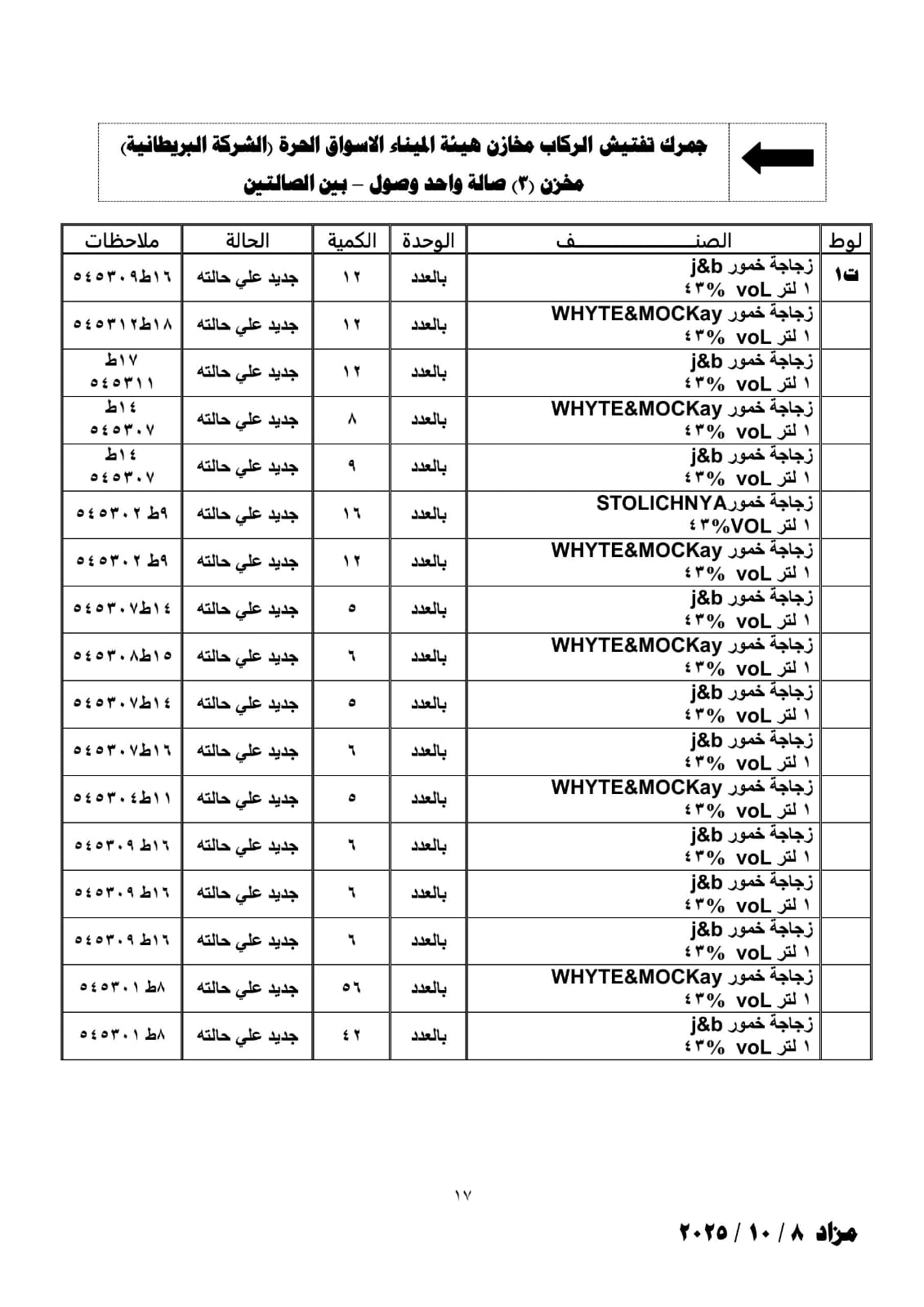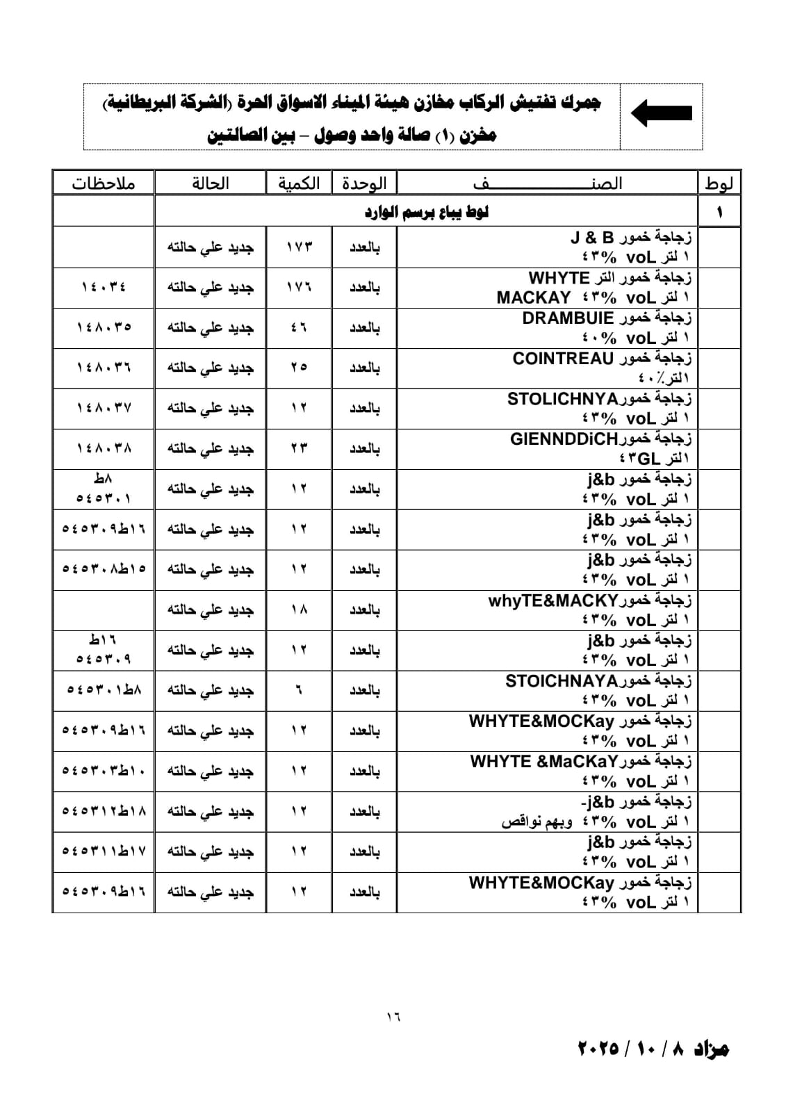 ويسقط حق أصحاب المهامل مالم يتم سحبها قبل اعتماد جلسة المزاد والبضائع منها يباع برسم الوارد والبعض برسم الصادر .