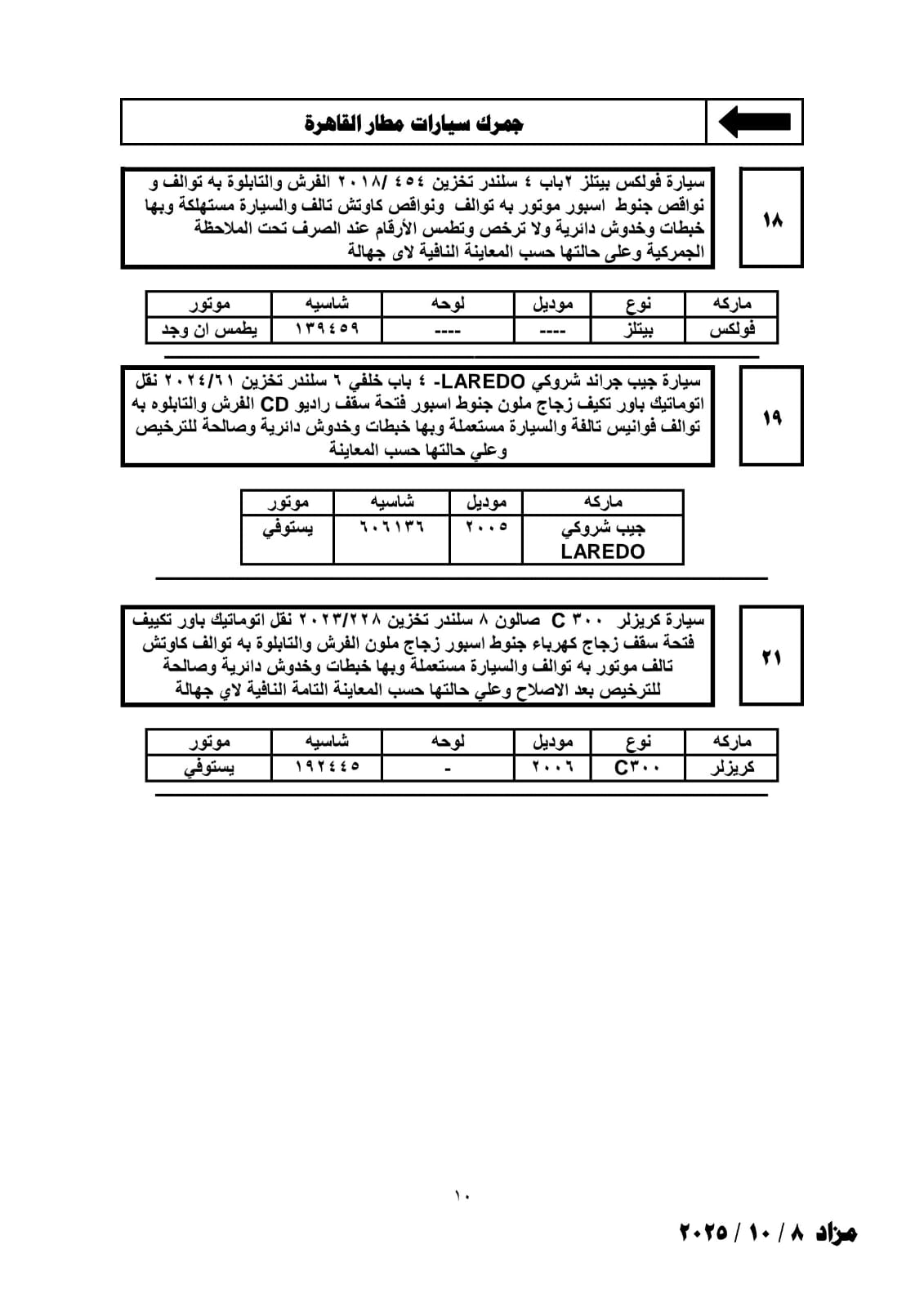 تفاصيل جلسة مزاد 8 أكتوبر لسيارات وبضائع جمارك مطار القاهرة