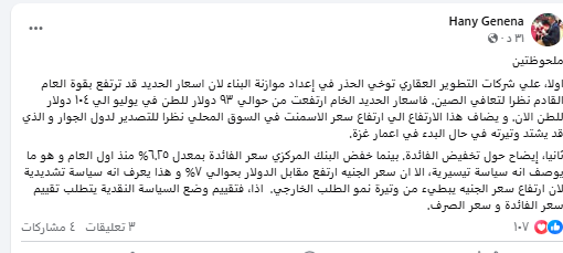 وأضاف في منشور له على صفحته عبر موقع التواصل الاجتماعي فيسبوك، إن أسعار الحديد الخام ارتفعت من حوالي 93 دولار للطن في يوليو إلى 104 دولار للطن الآن، ويضاف هذا الارتفاع إلى ارتفاع سعر الأسمنت في السوق المحلي نظرًا للتصدير لدول الجوار والذي قد يشتد وتيرته في حال البدء في إعمار غزة.