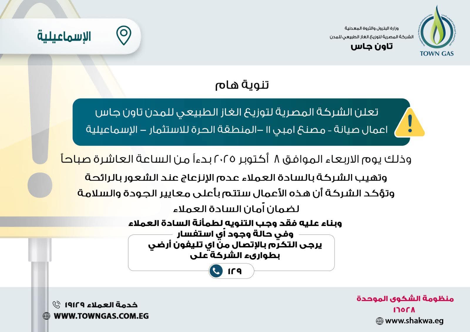 تنويه هام من «تاون جاس» لسكان الإسماعيلية، تفاصيل