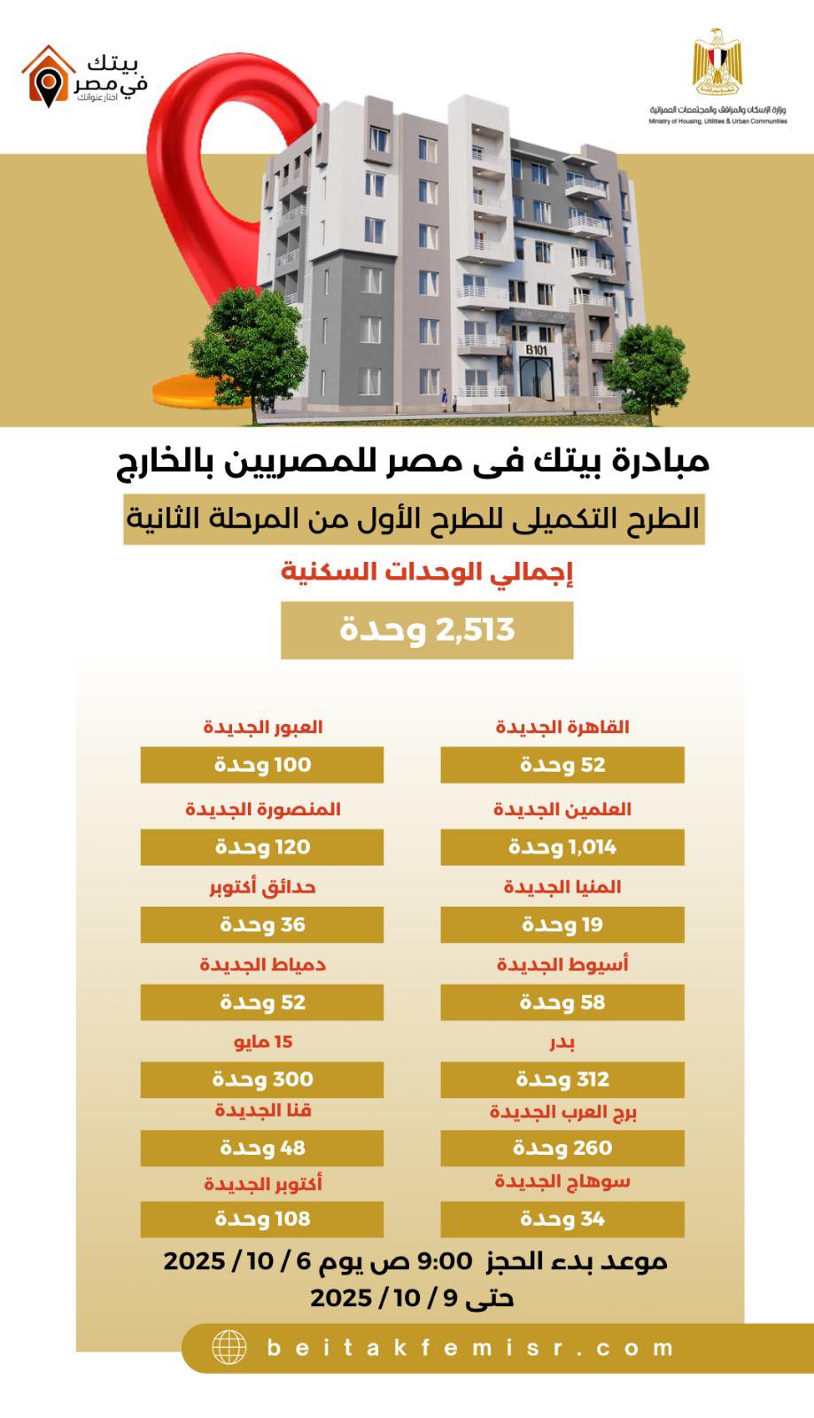 التقديم على الطرح التكميلي للطرح الأول للمرحلة الثانية من مبادرة "بيتك في مصر" للمصريين بالخارج، متاح على الرابط https://beitakfemisr.com حتى يوم الخميس 9/10/2025.