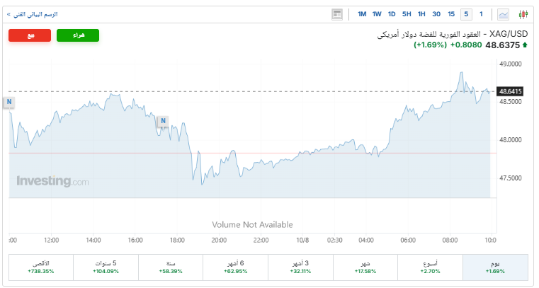 أسعار الفضة ترتفع اليوم الأربعاء بنسبة 1.6% عند 48.63 دولار للأوقية