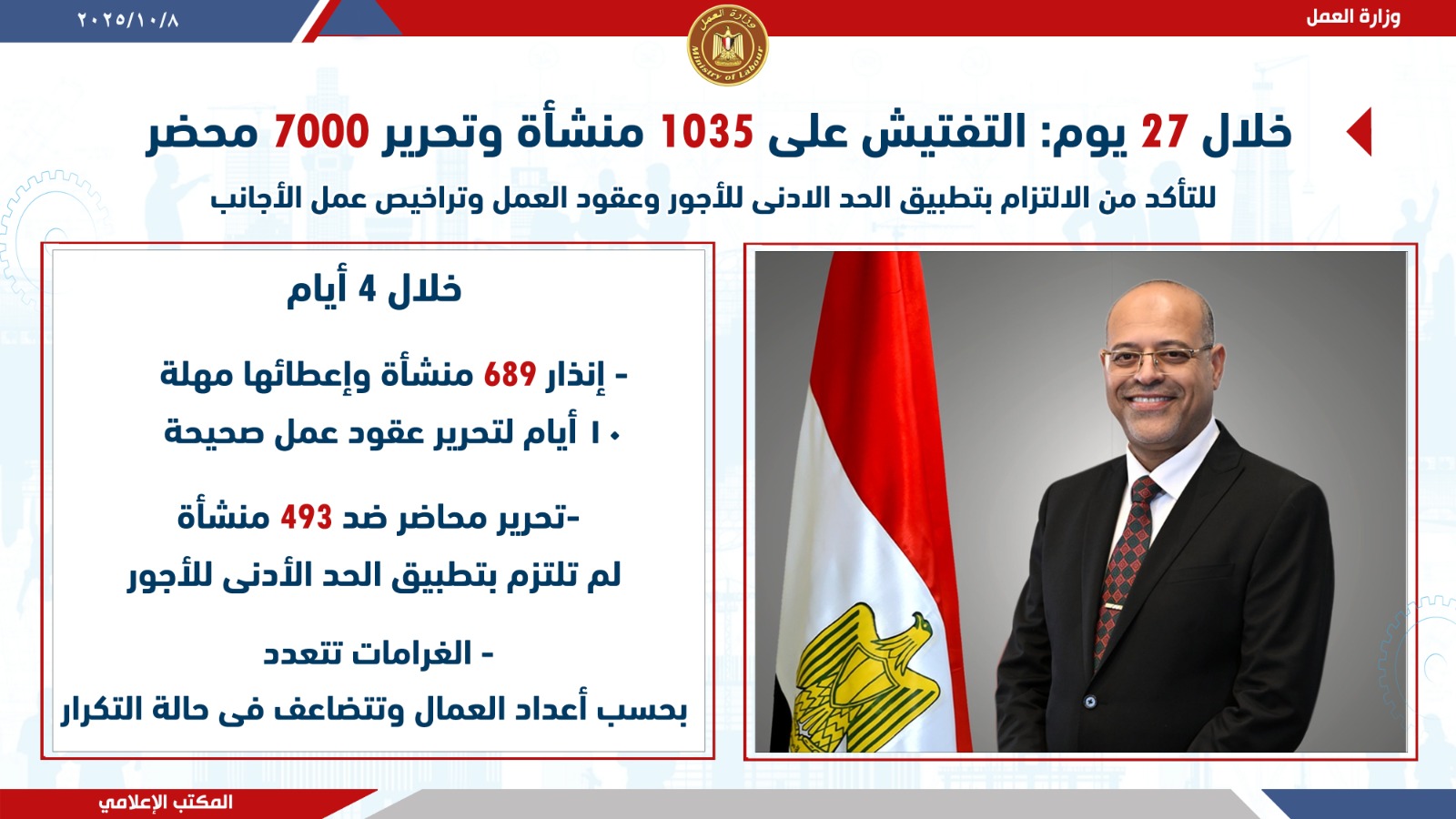 كما أوضح الوزير أن حملة تفتيشية إستمرت خلال الـ4 أيام الماضية، شهدت إنذار 689 منشأة، وإعطائها مهلة 10 أيام لتحرير عقود عمل طبقًا للقانون الجديد، وكذلك تحرير محاضر ضد 493 منشأة لم تلتزم بتطبيق الحد الأدنى للأجور خلال الـ4 أيام المذكورة