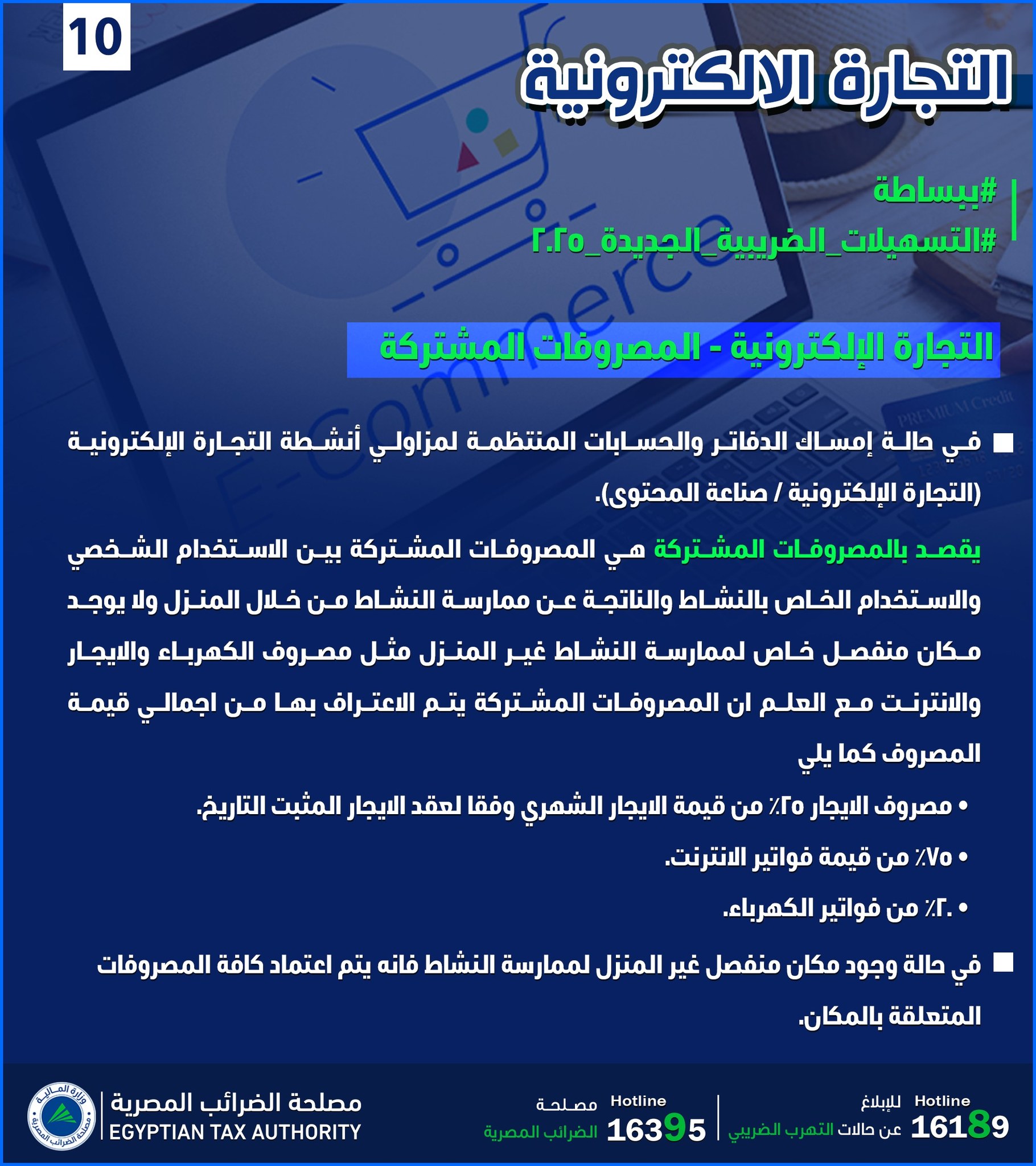 أعلنت مصلحة الضرائب المصرية تفاصيل جديدة بشأن التسهيلات الضريبية لعام 2025، لمزاولي أنشطة التجارة الإلكترونية وصناعة المحتوى، موضحة كيفية احتساب المصروفات المشتركة التي تجمع بين الاستخدام الشخصي والنشاط المهني في حال ممارسة النشاط من المنزل.