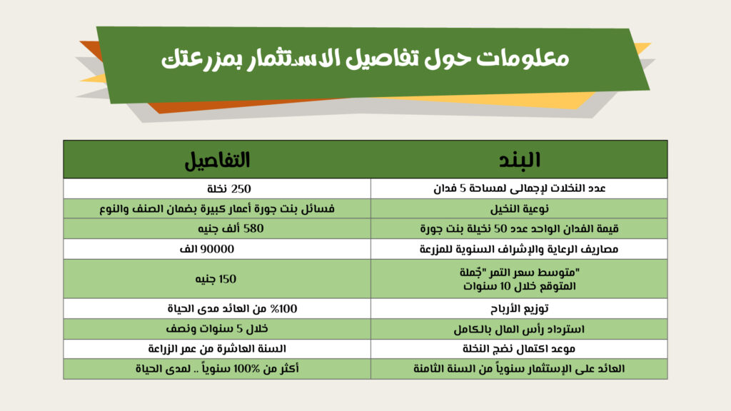 حيث يبدأ عائد الفدان الواحد من السنة الثالثة من الناتج الثمرى، وناتج الفسائل بإجمالى 50 ألف جنيه، ثم يتصاعد العائد سنويًا حتى يصل إلى 900 ألف جنيه في السنة العاشرة من عمر النخلة، والتي يستقر عندها العائد والأرباح لمدى الحياة، حيث يصل متوسط أعمار النخيل ما بين 100 إلى 150 عامًا.
