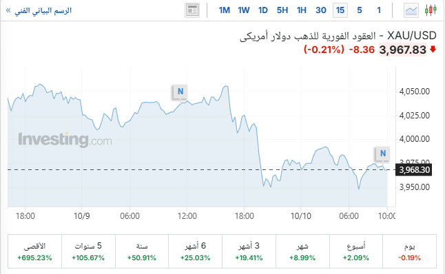 أسعار الذهب تتراجع 0.21% عالميًا ويستقر عند 3967 ألف دولار للأوقية