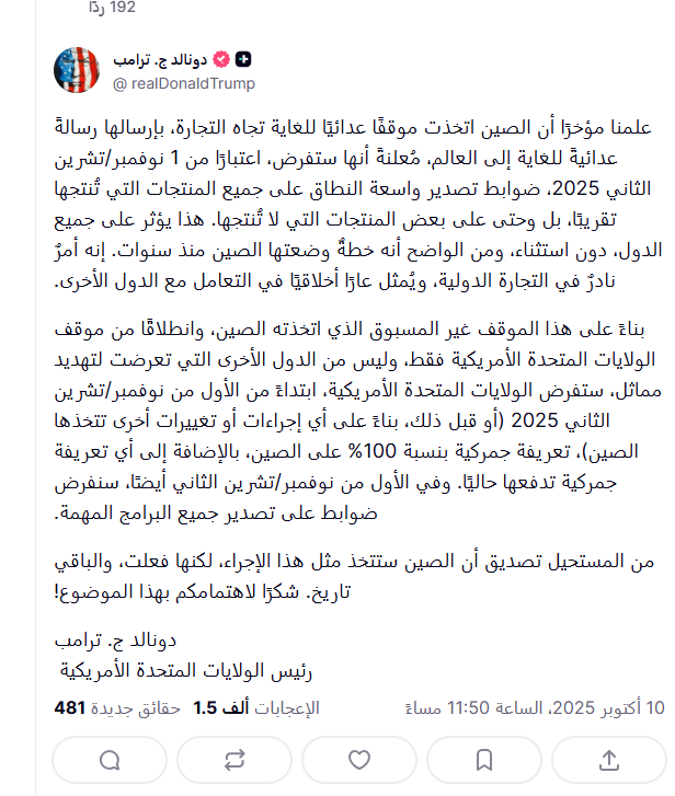 وتابع: “بناءً على هذا الموقف غير المسبوق الذي اتخذته الصين، وانطلاقًا من موقف الولايات المتحدة الأمريكية فقط، وليس من الدول الأخرى التي تعرضت لتهديد مماثل، ستفرض الولايات المتحدة الأمريكية، ابتداءً من الأول من نوفمبر 2025، تعريفة جمركية بنسبة 100% على الصين، إضافة إلى أي تعريفة جمركية تدفعها حاليًا”.