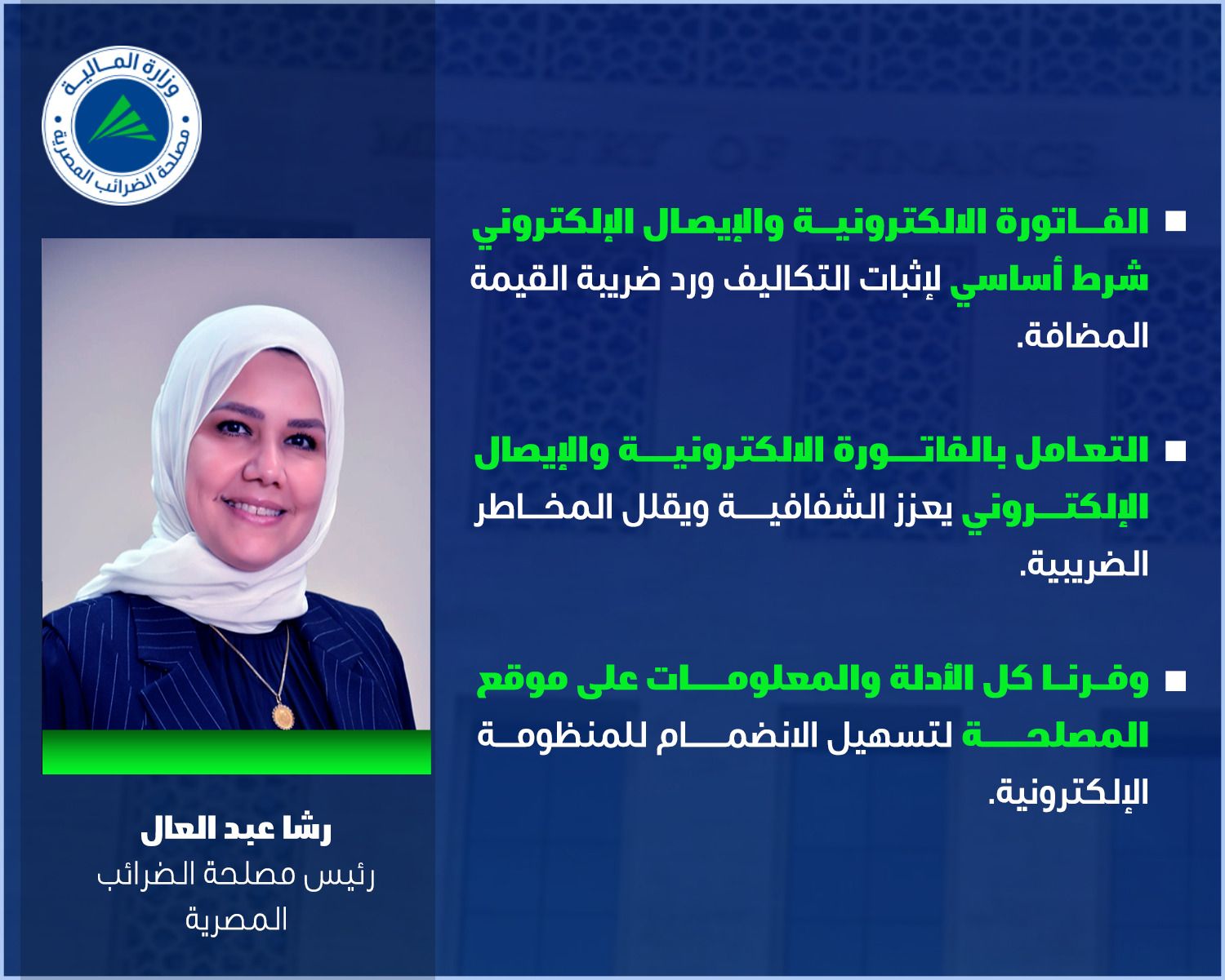 أكدت رشا عبد العال، رئيس مصلحة الضرائب المصرية، أن الالتزام بمنظومتي الفاتورة الإلكترونية والإيصال الإلكتروني أصبح ضرورة ملحة، ليس فقط للالتزام بالتشريعات الضريبية، ولكن أيضًا لضمان استقرار الأعمال وتعزيز الثقة بين الممولين والعملاء.