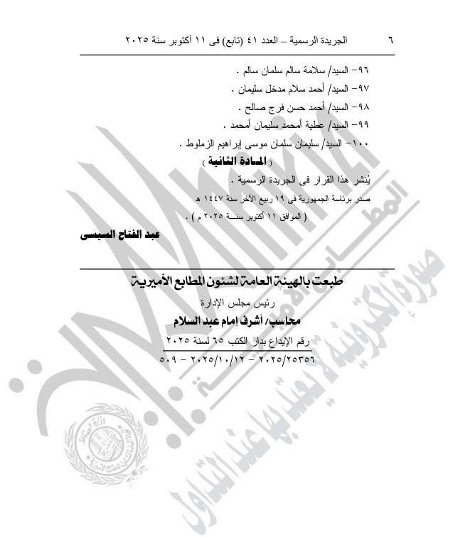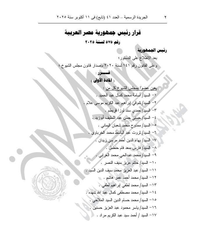 نشرت الجريدة الرسمية في عددها رقم 41 (تابع) قرار الرئيس عبدالفتاح السيسي رقم 575 لسنة 2025 بتعيين أعضاء بمجلس الشيوخ.