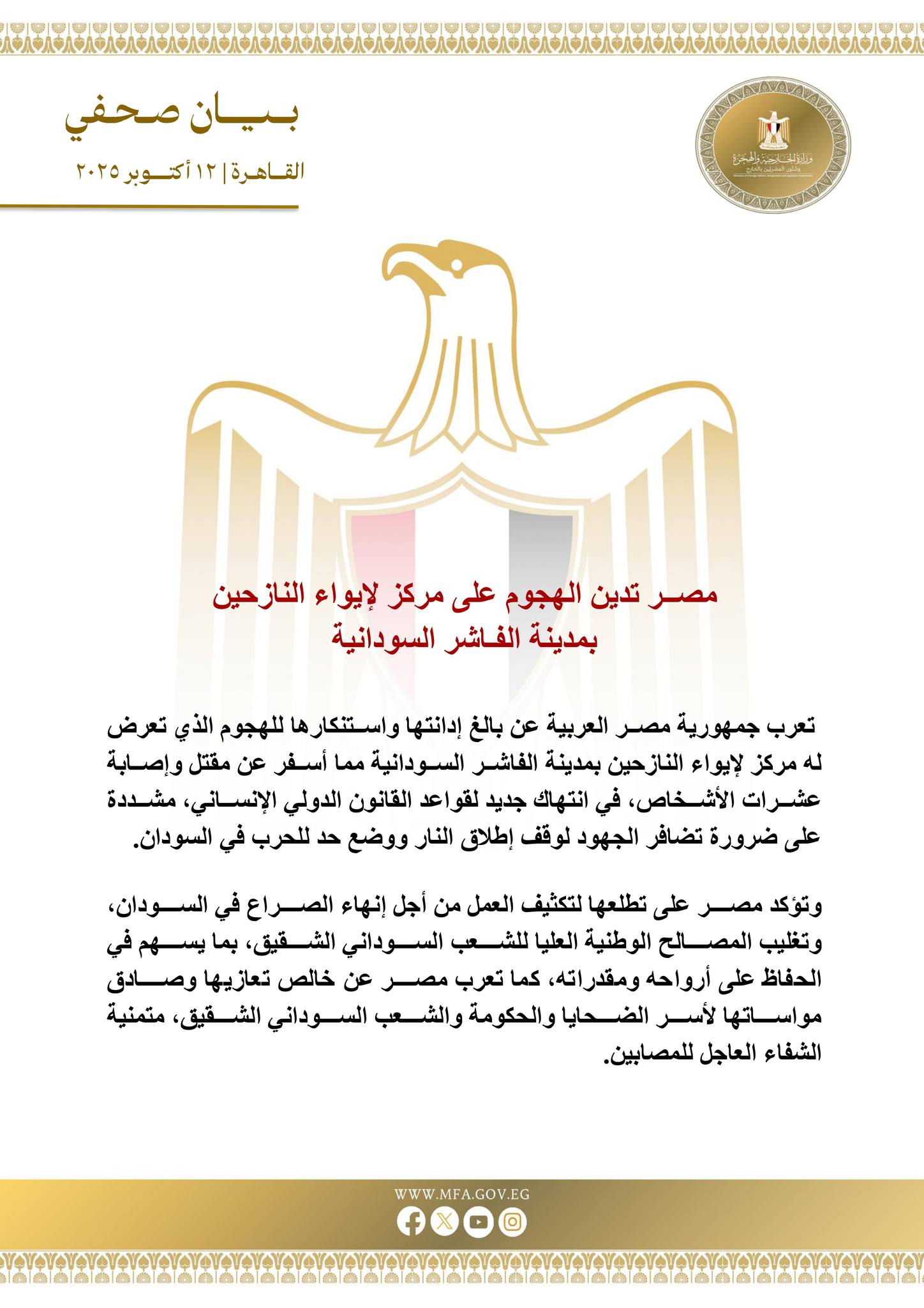أعربت مصر على تطلعها لتكثيف العمل من أجل إنهاء الصراع في السودان وتغليب المصالح الوطنية العليا للشعب السوداني الشقيق، بما يسهم في الحفاظ على أرواحه ومقدراته، وقدمت تعازيها لأسر الضحايا والحكومة والشعب السوداني الشقيق، متمنية الشفاء العاجل للمصابين.
