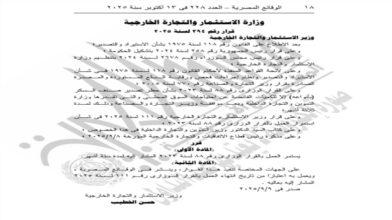 نشرت الجريدة الرسمية، اليوم الاثنين الموافق 13/10/2025، قرار رقم 394 لسنة 2025 الصادر عن وزارة الاستثمار والتجارة الخارجية، بشأن حظر تصدير السكر بأنواعه إلا الكميات الفائضة عن احتياجات السوق المحلية، في العدد 228 في 13 أكتوبر 2025.