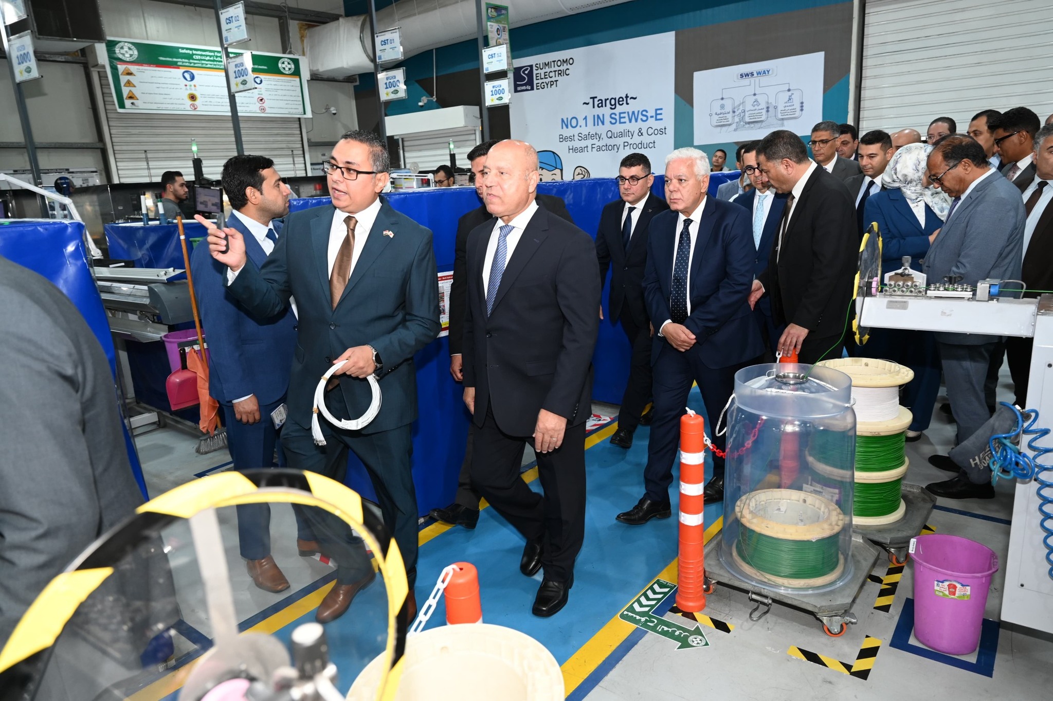 واختتم الوزير جولته بزيارة مجمع مصانع شركة سوميتومو وايرينج سيستيمز إيجيبت المتخصص في تصنيع ضفائر السيارات والمقام على مساحة 23 ألف متر مربع بمبيعات يبلغ 100 مليون يورو، وتبلغ طاقته الإنتاجية 11 مليون ضفيرة سنوياً، ونسبة المكون المحلي أكثر من 42% ويصدر المجمع منتجاته بالكامل لأسواق تركيا وسلوفاكيا وفرنسا والتشيك وبولندا والمجر، ويوظف أكثر من 4200 عامل وموظف، وقد رافق الوزير خلال الجولة المهندس/ حسن الخطيب، وزير الاستثمار والتجارة الخارجية، والمهندس/ عادل النجار، محافظ الجيزة والسيد/ محمد همام العضو المنتدب للشركة، وتفقد الوزير خلال الزيارة خطوط إنتاج ضفائر سيارات (بيجو-ستروين-أوبل-تويوتا) كما تفقد معرضاً للمنتجات النهائية للمصنع.