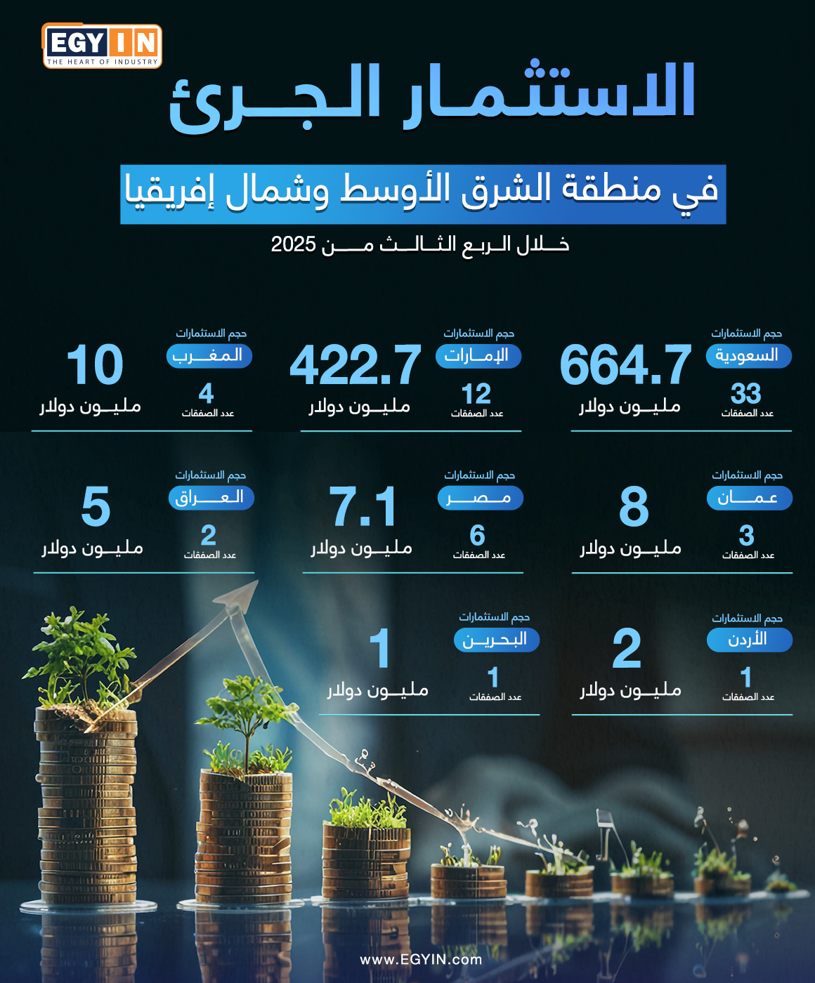 وقد رفع الربع الثالث من عام 2025 قيمة الاستثمار الجرئ في الشركات الناشئة في منطقة الشرق الأوسط وشمال إفريقيا، خلال الـ9 أشهر المنقضية من العام الجاري، إلى رقم قياسي تجاوز ملياري دولار بتسجيل الربع الثالث 1.4 مليار دولار، مقارنة مع ما شهده العام الماضي كاملًا بنحو 1.38 مليار دولار، وعام 2023 الذي شهد استثمارات بنحو 1.98 مليار دولار، وحظيت المملكة العربية السعودية بنصيب الأسد من قيمة الاستثمارات في الربع الثالث بنحو 664.7 مليون دولار عبر 33 جولة استثمارية، لترفع إجمالي ما جمعته خلال 2025 إلى 1.01 مليار دولار عبر 88 جولة استثمارية.
