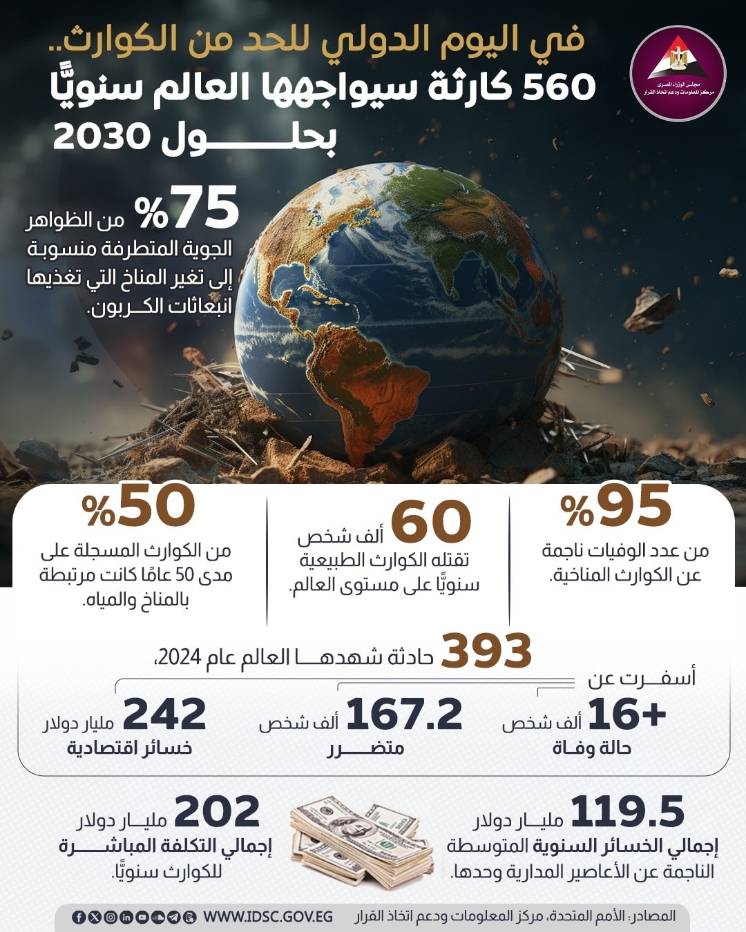 واستعرض مركز المعلومات ودعم اتخاذ القرار بمجلس الوزراء تقرير للأمم المتحدة، أوضح أن اليومُ الدولي للحدّ من مخاطر الكوارث لعام 2025 يدعو إلى إجراءين متلازمين: زيادةُ التمويل المخصّص للحدّ من مخاطر الكوارث في الموازنات العامة والبرامج الدولية، وكفالةُ أن تكون جميعُ استثمارات التنمية والاستثمارات الخاصّة مُراعيةً للمخاطر وقادرةً على الصمود.