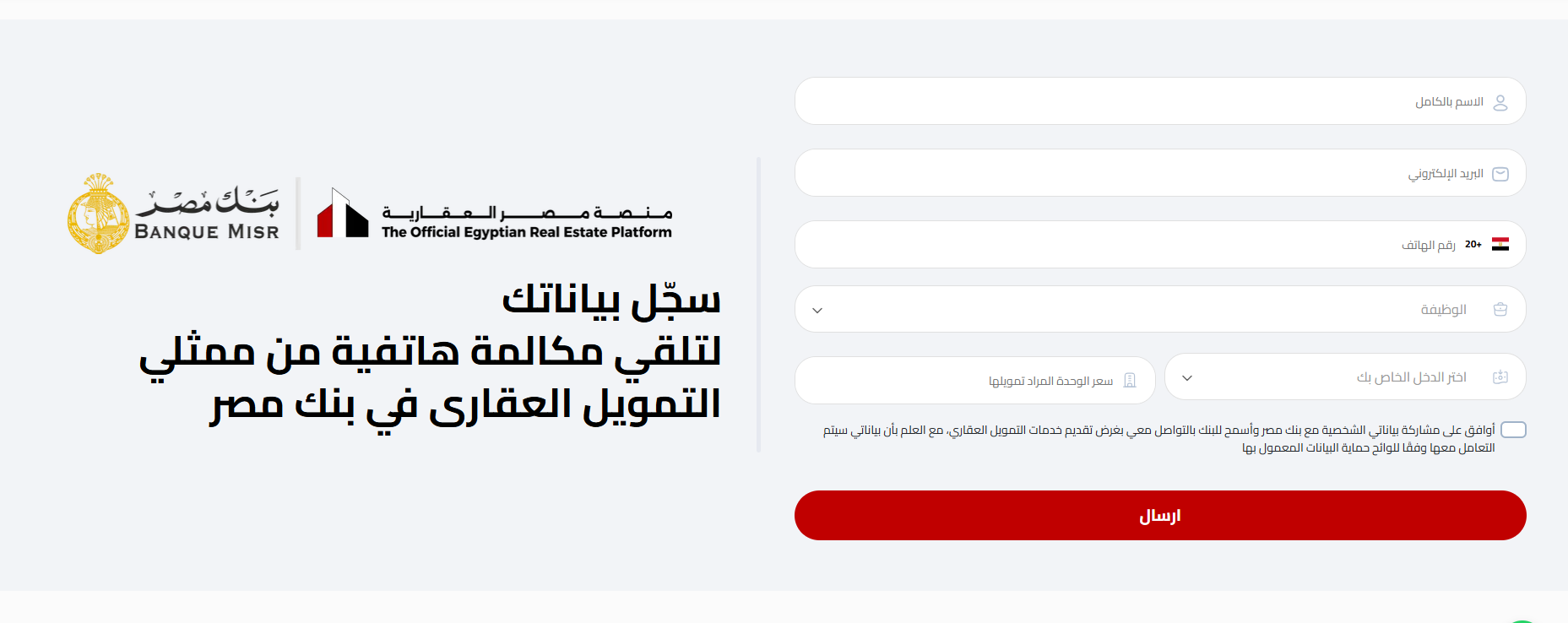 “اشتري البيت اللي نفسك فيه من خلال التمويل العقاري من بنك مصر”، خدمة جديدة كشفت عنها منصة مصر العقارية على موقعها الرسمي، وذلك في ضوء حرص المنصة العمل على تأمين مستقبل العقارات في مصر بالتعاون مع الشريك المالي، بنك مصر.