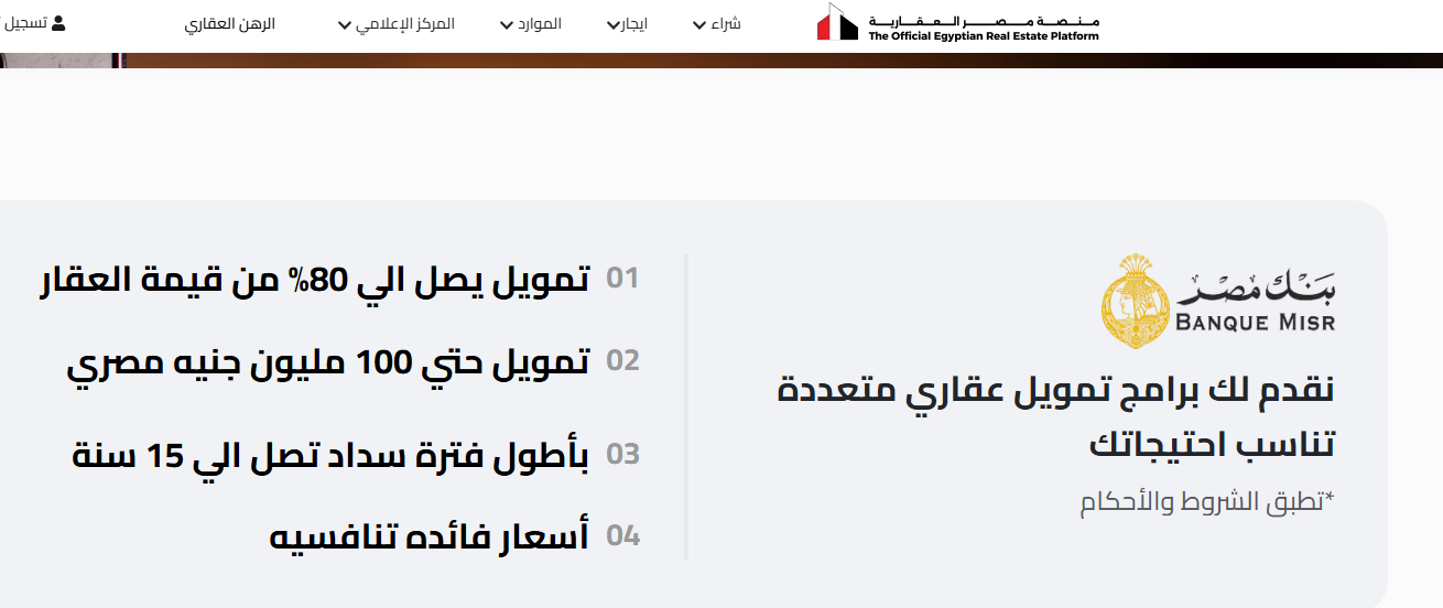 رحلتك للحصول على تمويل عقاري من خلال منصة مصر العقارية وشريكها الرئيسي "بنك مصر"، تبدأ بالدخول على منصة مصر العقارية على الرابط https://realestate.gov.eg/ar. ، واختيار خدمة التمويل العقاري من خلال المنصة، وكتابة بياناتك ومتضمنة الدخل وسعر الوحدة المراد تمويلها، يتاح لك اختيار مبلغ التمويل والدفعة المقدمة ومدة التمويل العقاري، ويمكنك حساب القسط الشهري من خلال خدمة موجودة على المنصة.